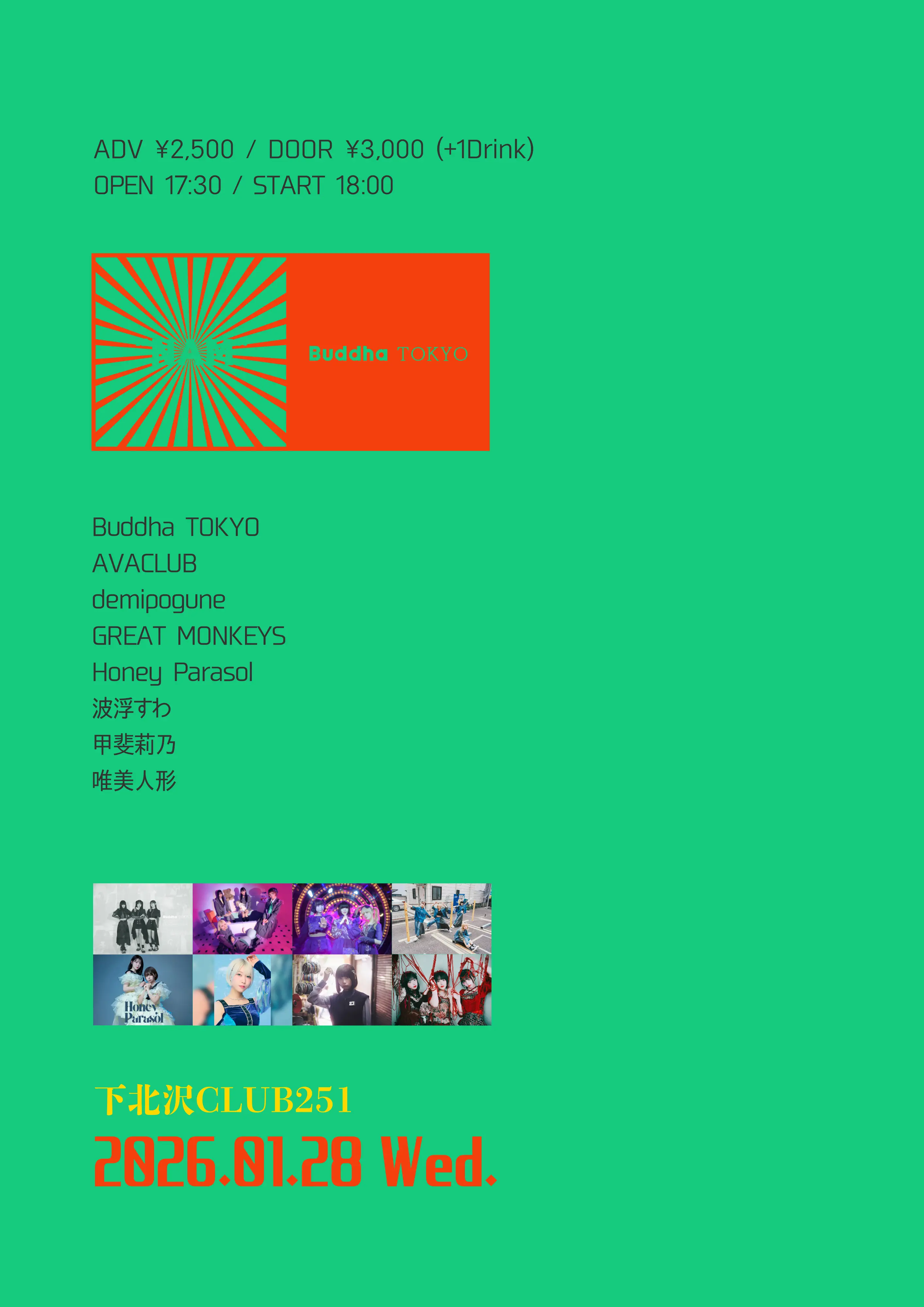 出演者 Buddha TOKYO / AVACLUB / GREAT MONKEYS / demipogune / Honey Parasol / 甲斐莉乃 / 波浮すわ / 唯美人形