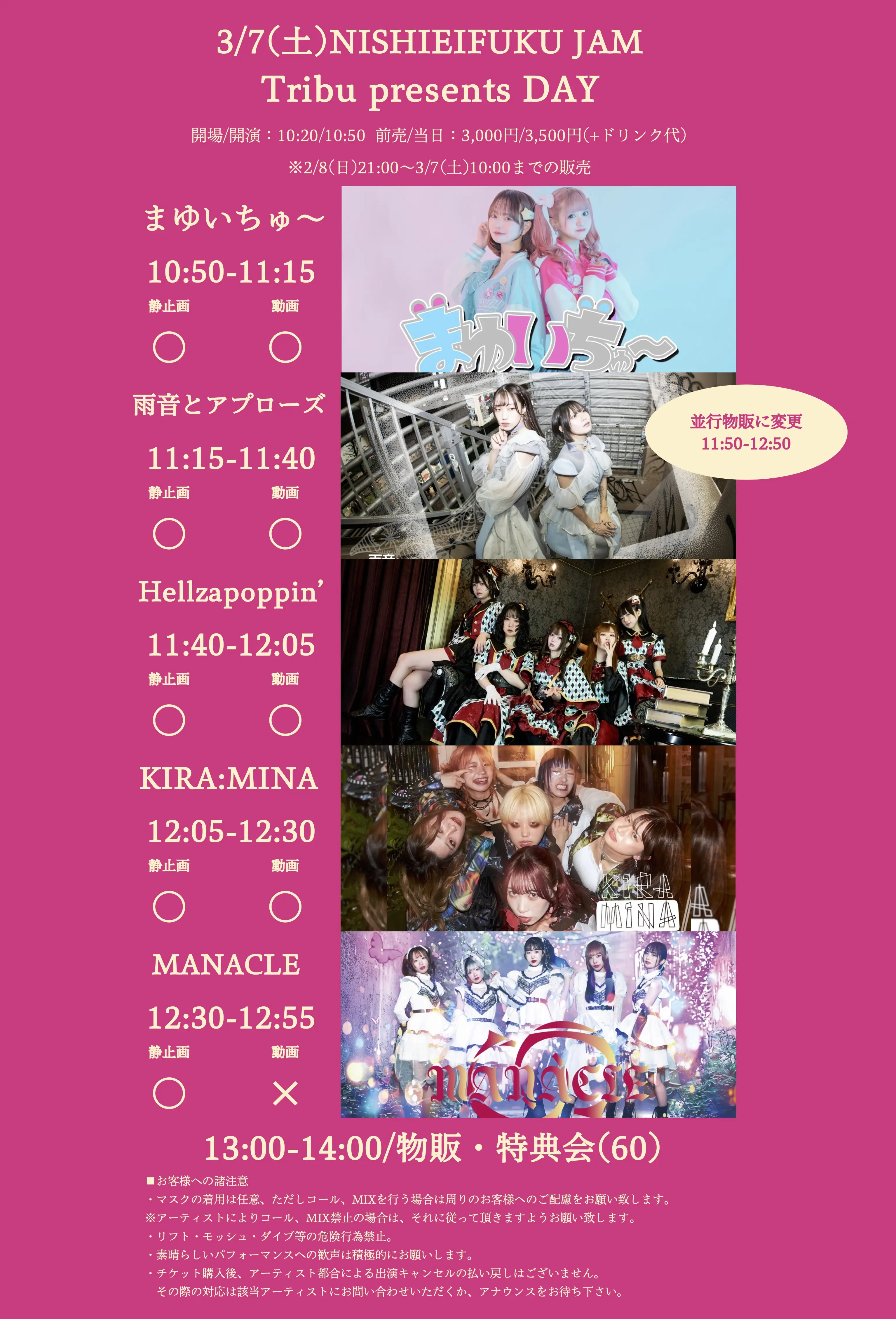 出演者 KIRA:MINA / まゆいちゅ〜 / 雨音とアプローズ / Hellzapoppin’ / MANACLE