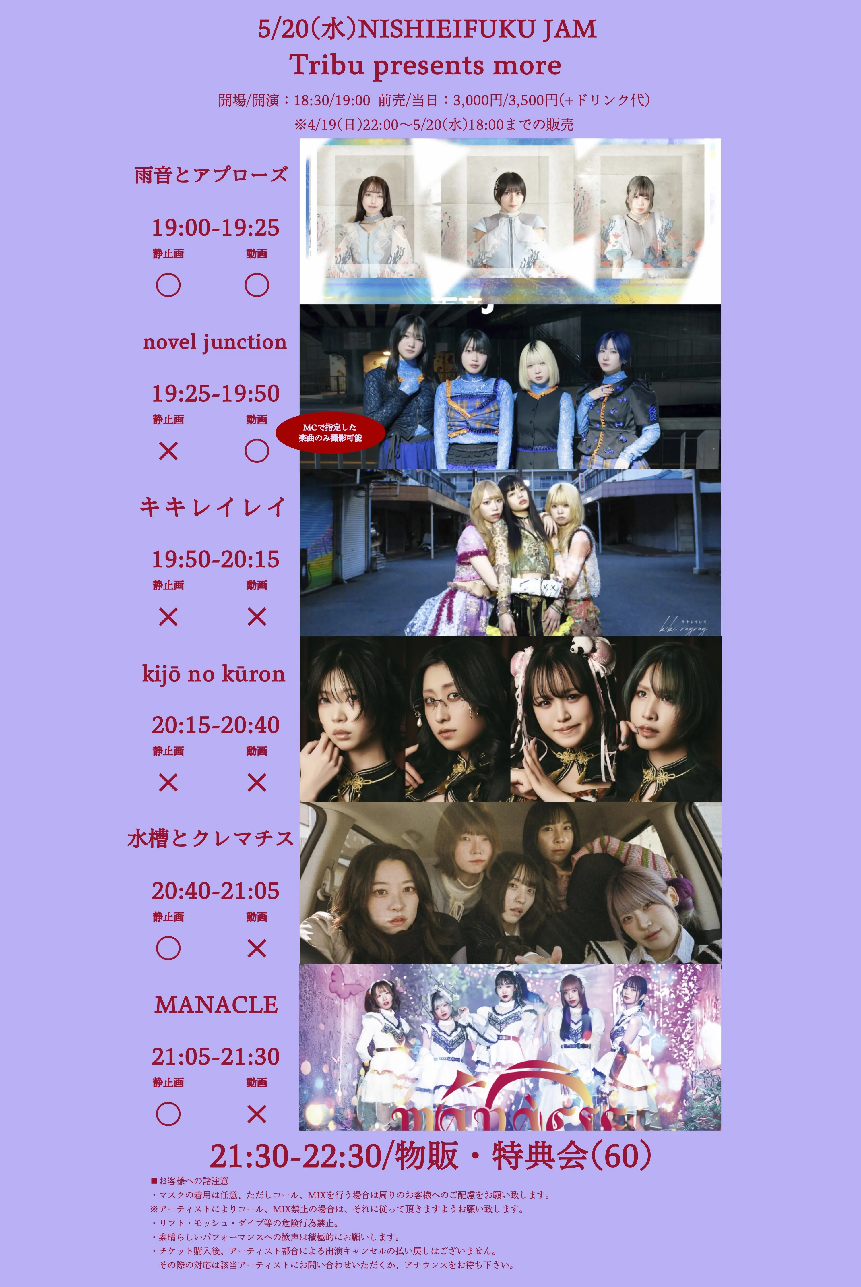 出演者 雨音とアプローズ / novel junction / キキレイレイ / kijō no kūron / 水槽とクレマチス / MANACLE