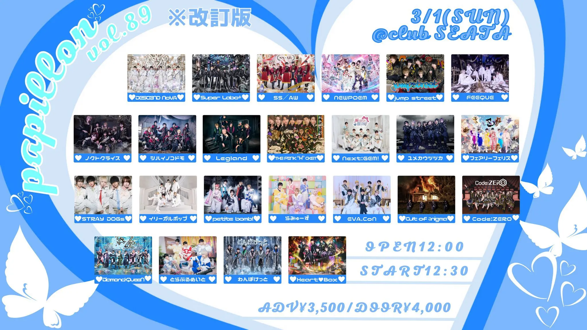 出演者 DESCEND NoVA / Super Labo+ / SS/AW / NEWPOEM / jump street / FEEQUE / ノクトクライス / シハイノコドモ / Legland / THE PINK “H” CKET / Next:GEM! / ユメカウツツカ / フェアリーフェリス / STRAY DOGs / イリーガルポップ / petite bomb! / らみゅーず / EVA.CoN / Cult of ǝnigma / Code:ZERO / Diamond・QueeN / とらぶるめいと / わんぽけっと / Heart❤︎Box
