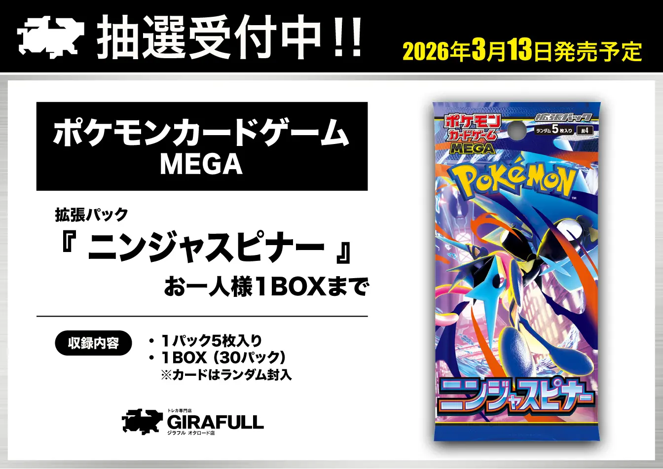 【GIRAFULLオタロード店】3/13(金)発売 ポケモンカードゲーム MEGA 拡張パック 「ニンジャスピナー」抽選受付