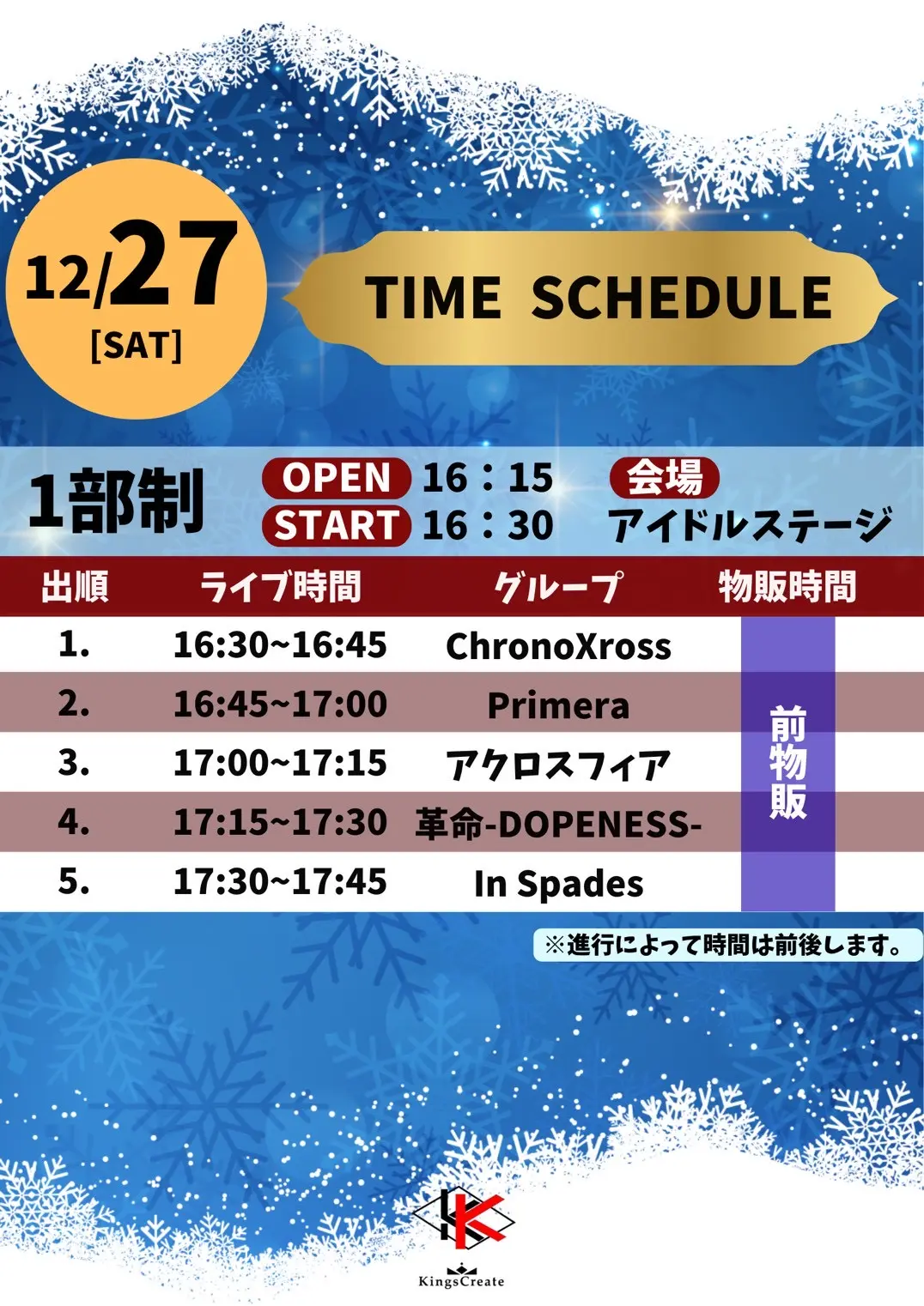 12/27 (土) 変則1部制 Primera・In Spades・革命-DOPENESS-・ChronoXross・アクロスフィア