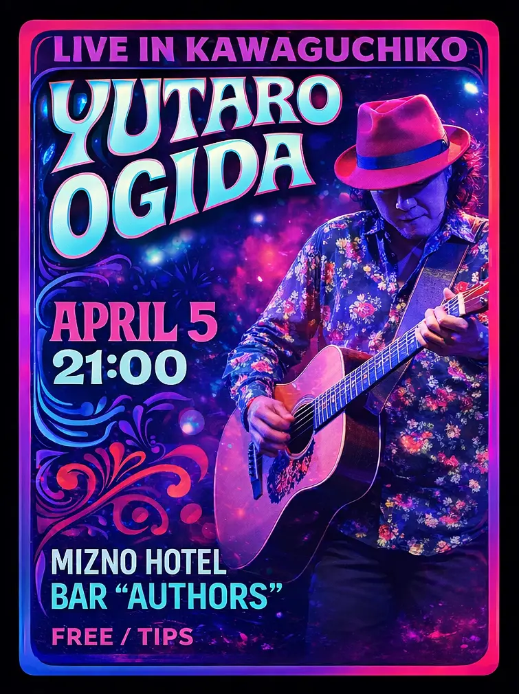 4/5(Sun) Yutaro Ogida Live in Fuji Kawaguchiko 2026 河口湖 Mizno Hotel Bar "Authors" からのLIVE配信を応援サポート!