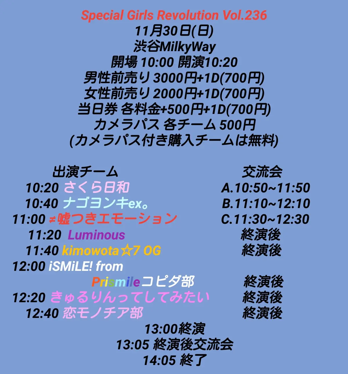 出演者 さくら日和 / ナゴヨンキex。 / ≠嘘つきエモーション / Luminous / kimowota☆7 OG / iSMiLE! from Prismileコピダ部 / きゅるりんってしてみたい / 恋モノチア部