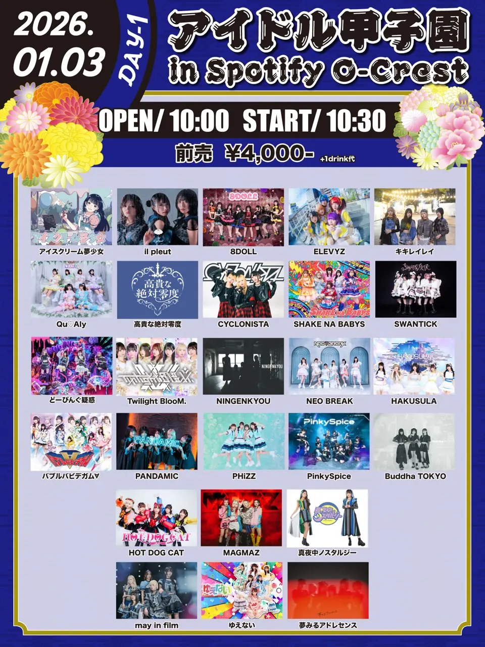 出演者 アイスクリーム夢少女 / il pleut / 8DOLL / ELEVYZ / Qu♡Aly / 高貴な絶対零度 / CYCLONISTA / SHAKE NA BABYS / SWANTICK / どーぴんぐ疑惑 / Twilight BlooM. / NEO BREAK / HAKUSULA / バブルバビデガム∀ / PANDAMIC / PHiZZ / HOT DOG CAT / MAGMAZ / 真夜中ノスタルジー / may in film / 夢みるアドレセンス / キキレイレイ / Buddha Tokyo / NINGEKNKYU / PinkySpice