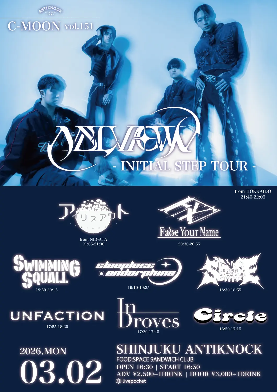 出演者 Sleepless Endorphine / NELVIOWL / アイリスアウト / SWIMMING SQUALL / False Your Name / In Droves / 細 / UNFACTION / Circle