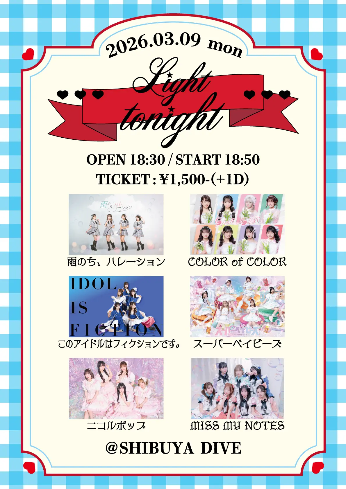 出演者 ニコルポップ / スーパーベイビーズ / 雨のち、ハレーション / COLOR of COLOR / このアイドルはフィクションです。 / MISS MY NOTES
