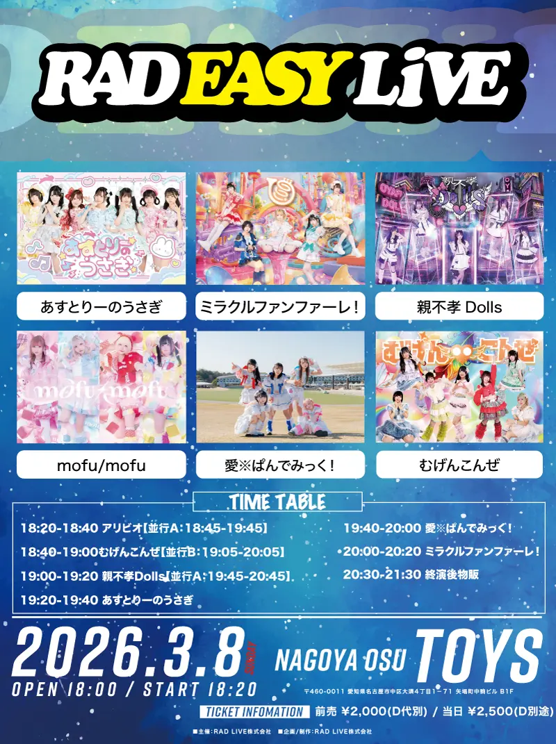 出演者 ミラクルファンファーレ! / むげんこんぜ / 親不孝Dolls / あすとりーのうさぎ / アリビオ / 愛※ぱんでみっく!