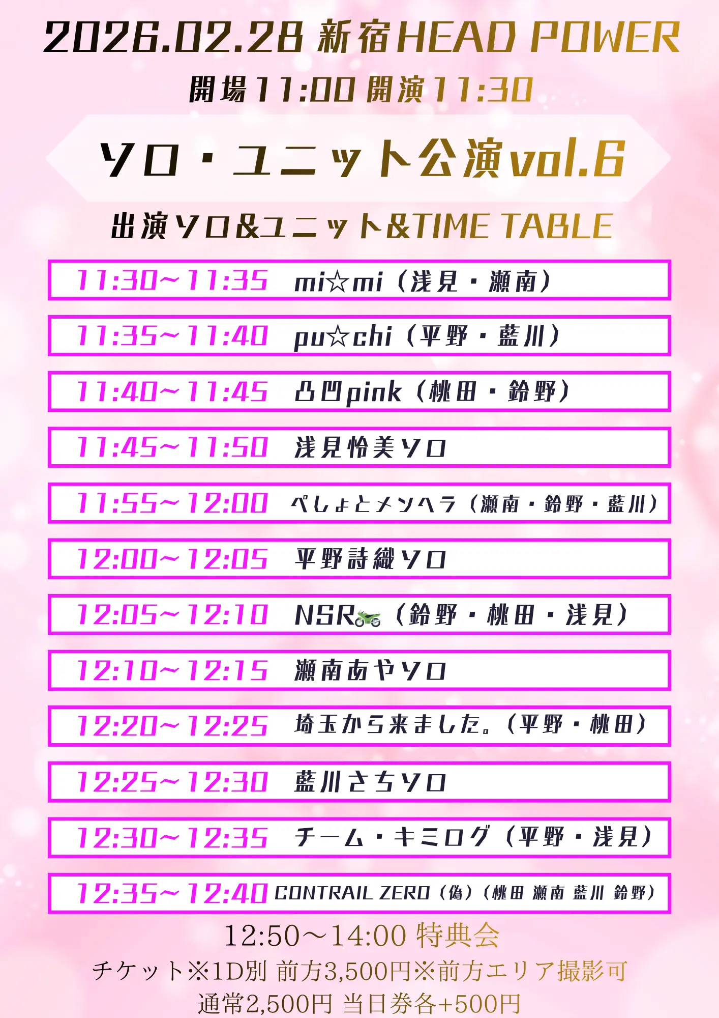 出演者 平野詩織ソロ / 浅見怜美ソロ / 藍川さちソロ / 瀬南あやソロ / pu☆chi(平野・藍川) / mi☆mi(浅見・瀬南) / 凸凹pink(桃田・鈴野) / CONTRAIL ZERO(偽)(桃田・瀬南・藍川・鈴野) / NSR🏍️(鈴野・桃田・浅見) / 埼玉から来ました。(平野・桃田) / ぺしょとメンヘラ(瀬南・鈴野・藍川) / チーム・キミログ(平野・浅見)