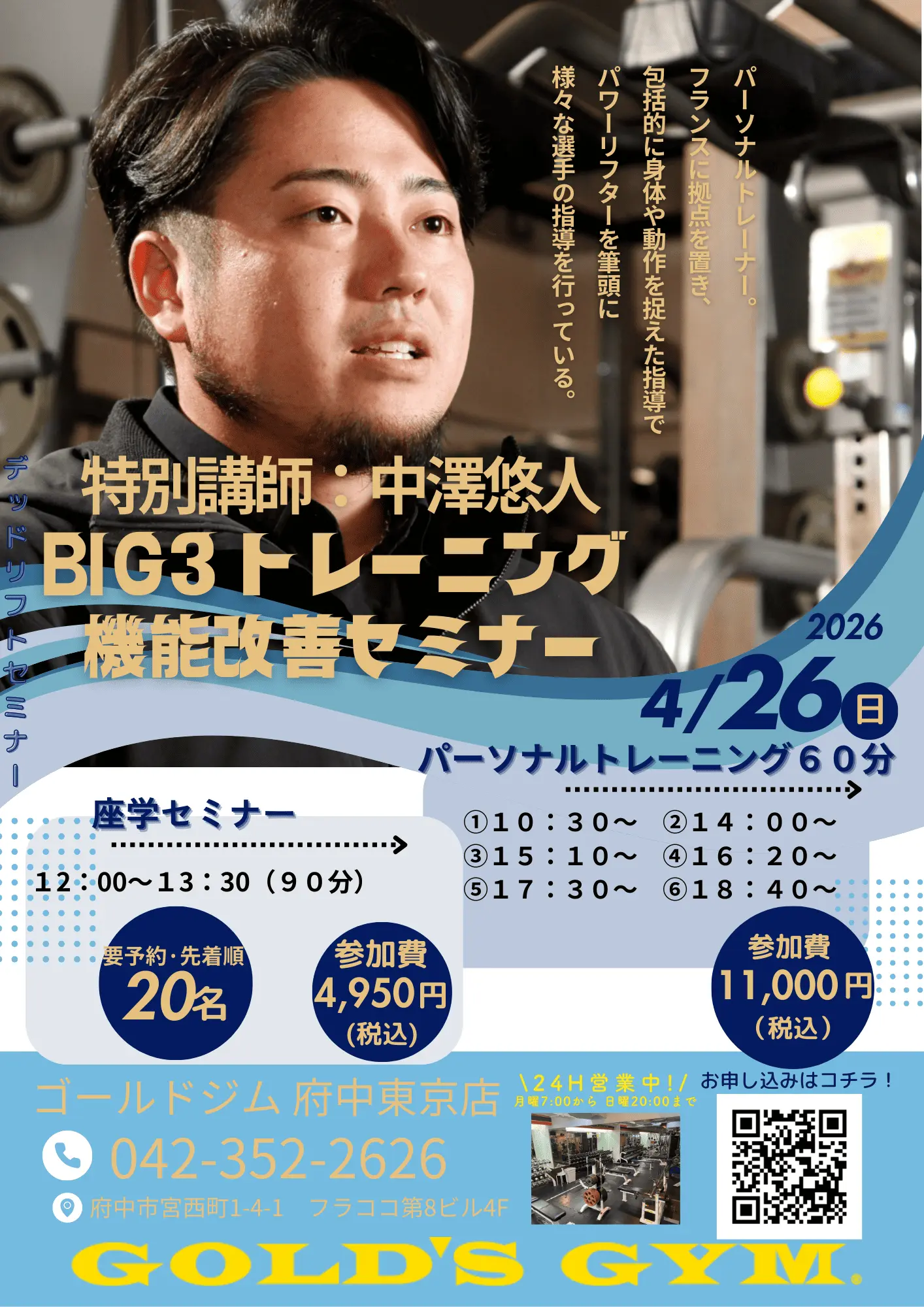 BIG3トレーニング機能改善セミナー/中澤悠人【ゴールドジム府中東京】