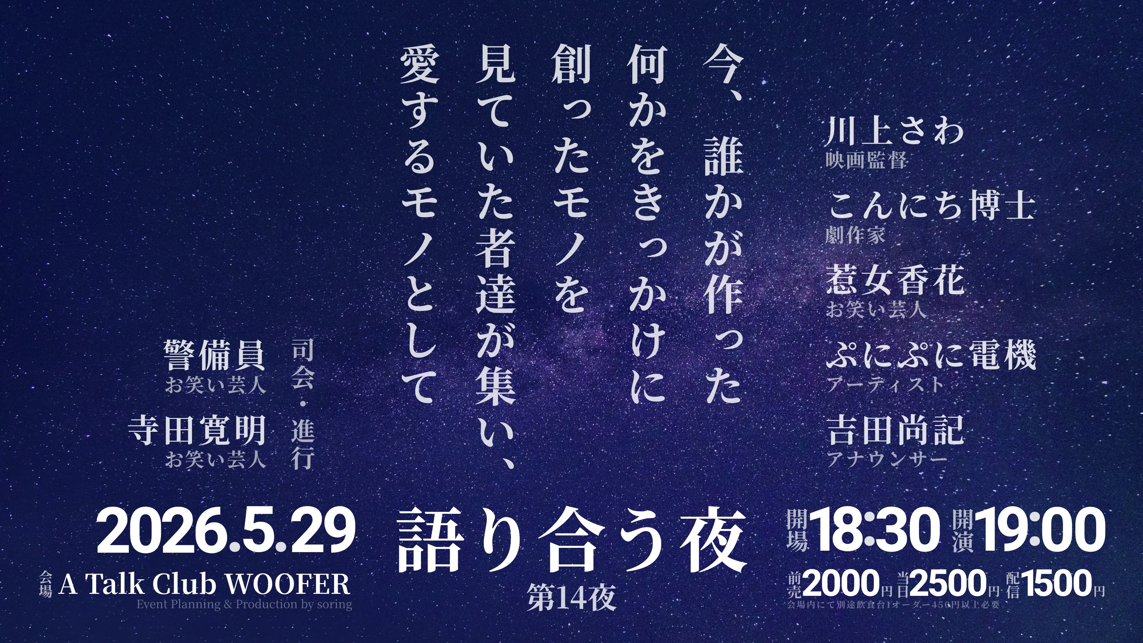出演者 寺田寛明 / 警備員 / 川上さわ(映画監督) / こんにち博士(劇作家) / 惹女香花(お笑い芸人) / ぷにぷに電機(アーティスト) / 吉田尚記(アナウンサー)
