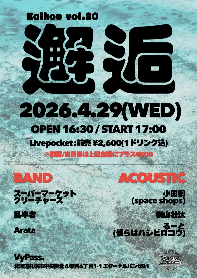 出演者 Arata / スーパーマーケットクリーチャーズ / 乱半者 / 小田桐(space shops) / 横山壮汰 / るーと(僕らはハシビロコウ)