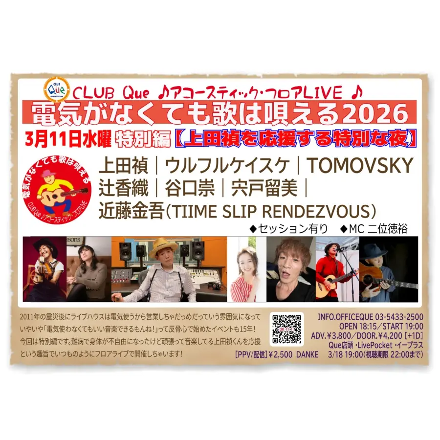 上田禎|ウルフルケイスケ|谷口崇|辻香織|宍戸留美|TOMOVSKY|近藤金吾(TIIME SLIP RENDEZVOUS):“電気が無くても歌は唄える2026 特別編 「上田禎を応援する特別な夜」”