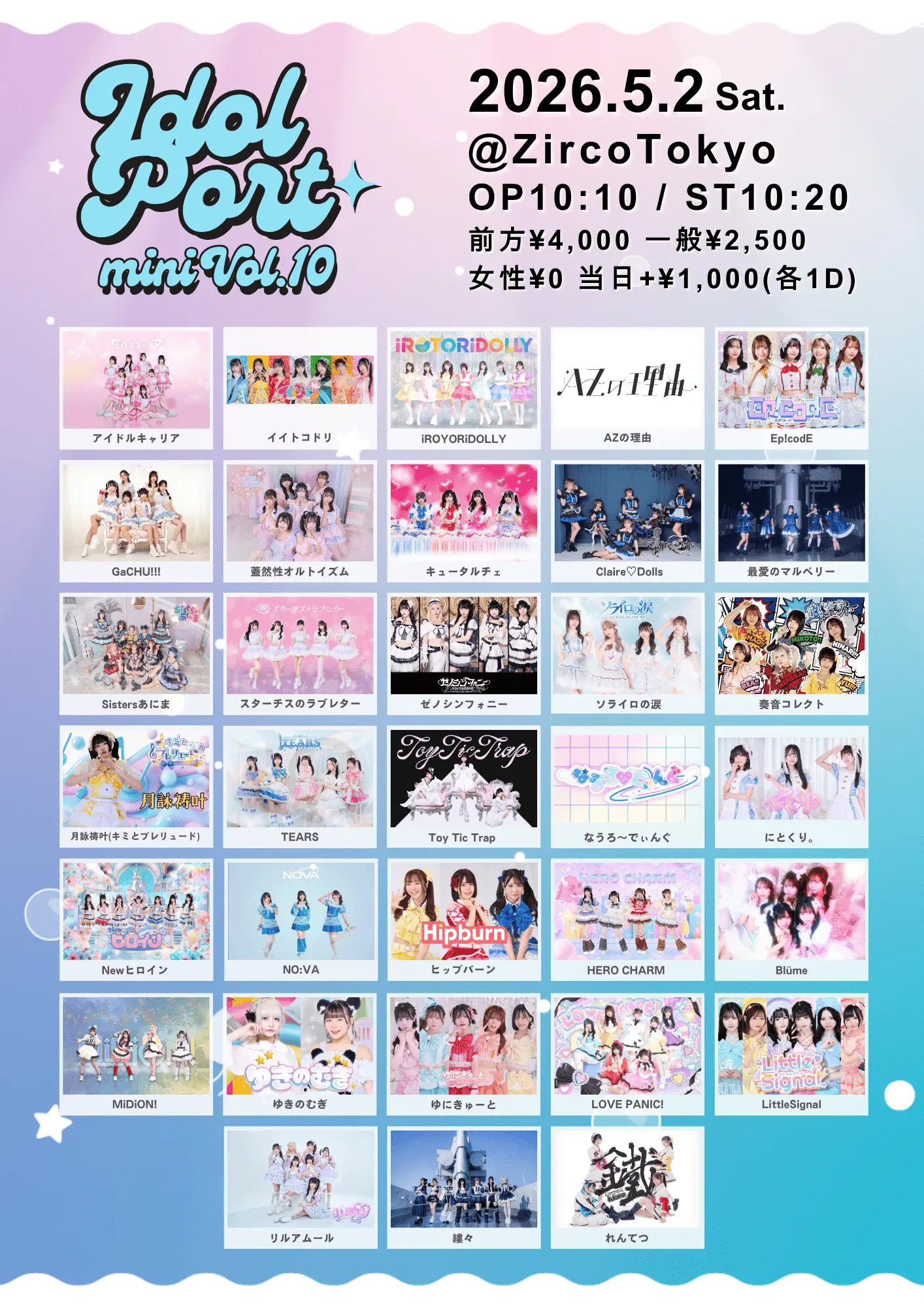 出演者 iROTORiDOLLY / 蓋然性オルトイズム / キュータルチェ / Sistersあにま / スターチスのラブレター / TEARS / 月詠祷叶(キミとプレリュード) / なうろ〜でぃんぐ / ゆきのむぎ / HERO CHARM / Blüme / LOVE PANIC! / LittleSignal / れんてつ / アイドルキャリア / イイトコドリ / AZの理由 / Claire♡Dolls / 最愛のマルベリー / ゼノシンフォニー / にとくり。 / Newヒロイン / NO:VA / MiDiON! / ゆにきゅーと / リルアムール / 縷々 / 奏音コレクト / Ep!codE / GaCHU!!! / ヒップバーン / ソライロの涙
