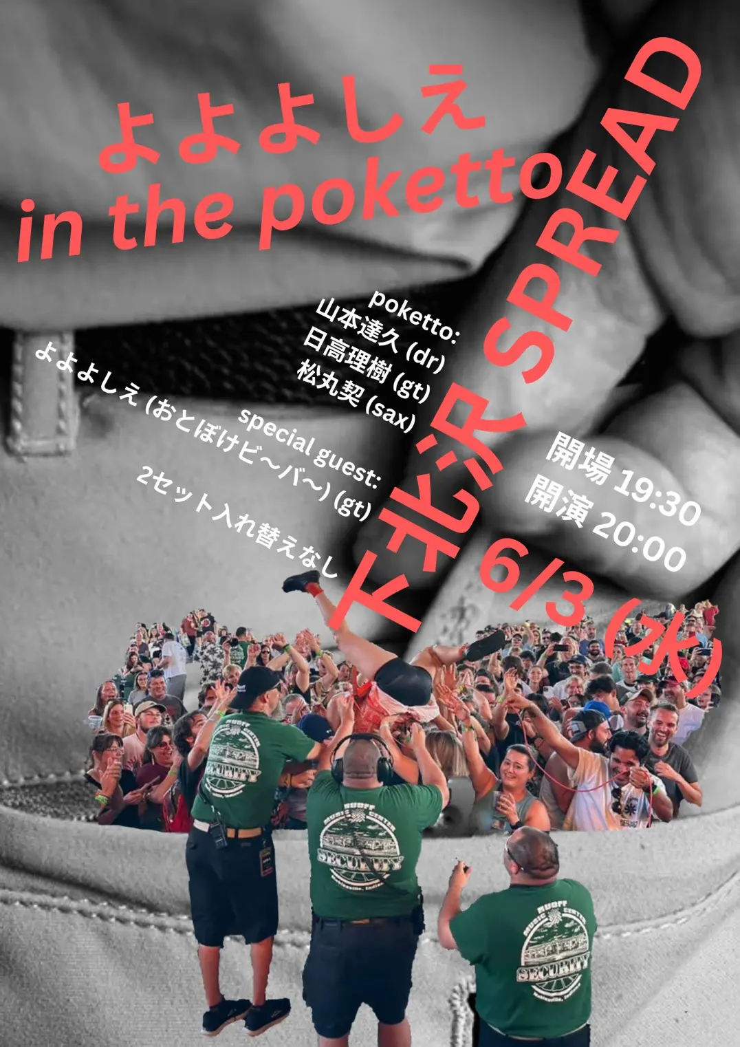 出演者 poketto 山本達久 (dr), 日高理樹 (gt), 松丸契 (sax) / よよよしえ (おとぼけビ〜バ〜)