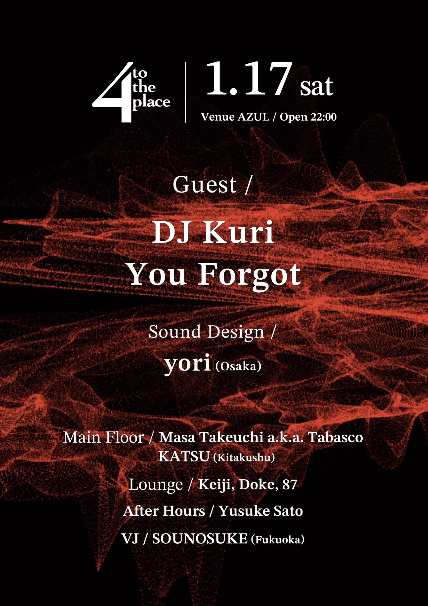 出演者 DJ KURI / You Forgot / Masa Takeuchi a.k.a.Tabasco / Yusuke Sato / keiji / Doke / 87 / SOUNOSUKE / KATSU / yori
