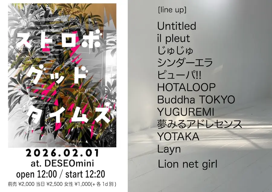 出演者 じゅじゅ / Lion net girl / ピューパ!! / Buddha TOKYO / il pleut / HOTALOOP / Untitled / シンダーエラ / YUGUREMI / 夢みるアドレセンス / YOTAKA / Layn