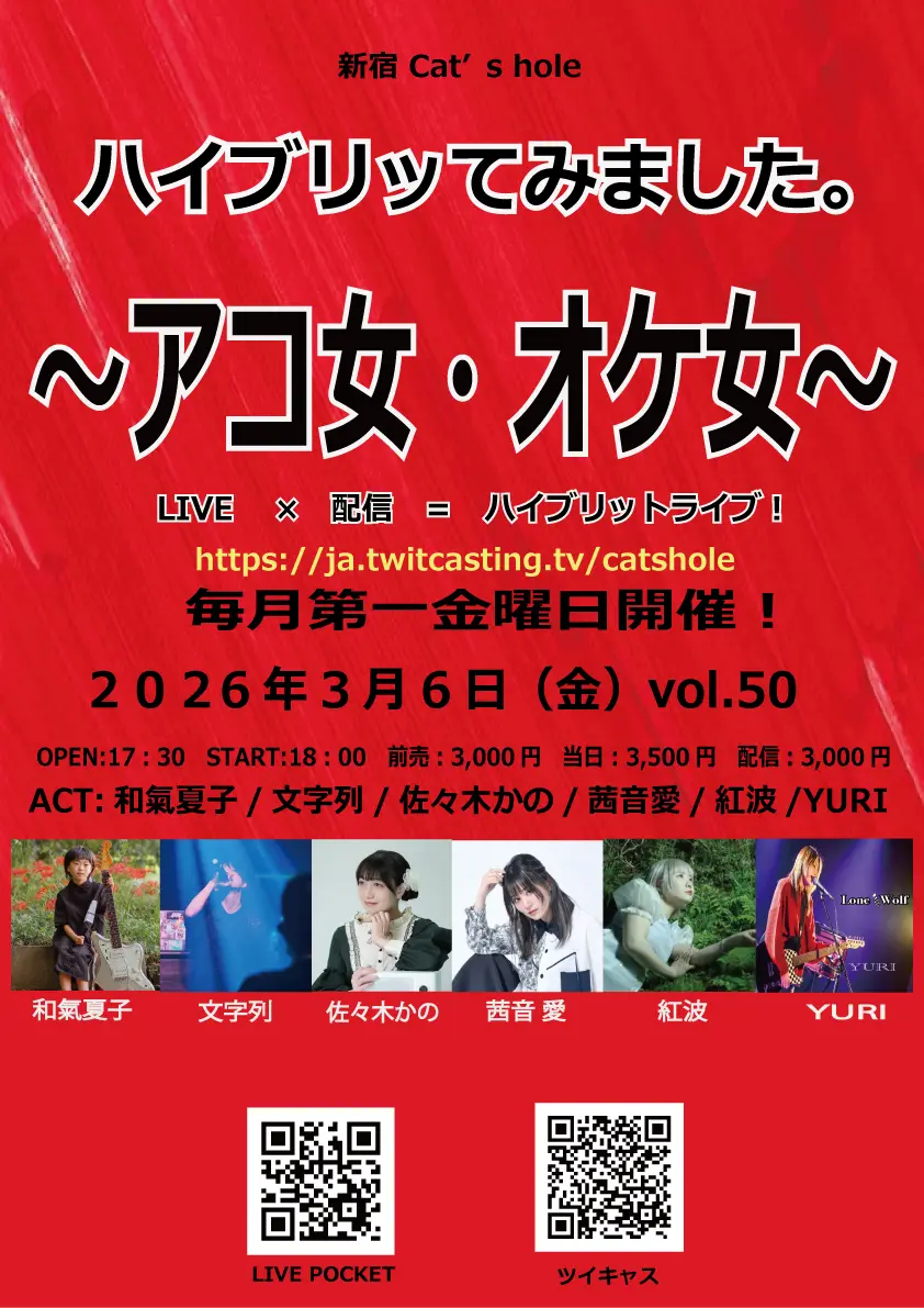 出演者 和氣夏子 / 茜音 愛 / 佐々木かの / 文字列 / 紅波 / YURI