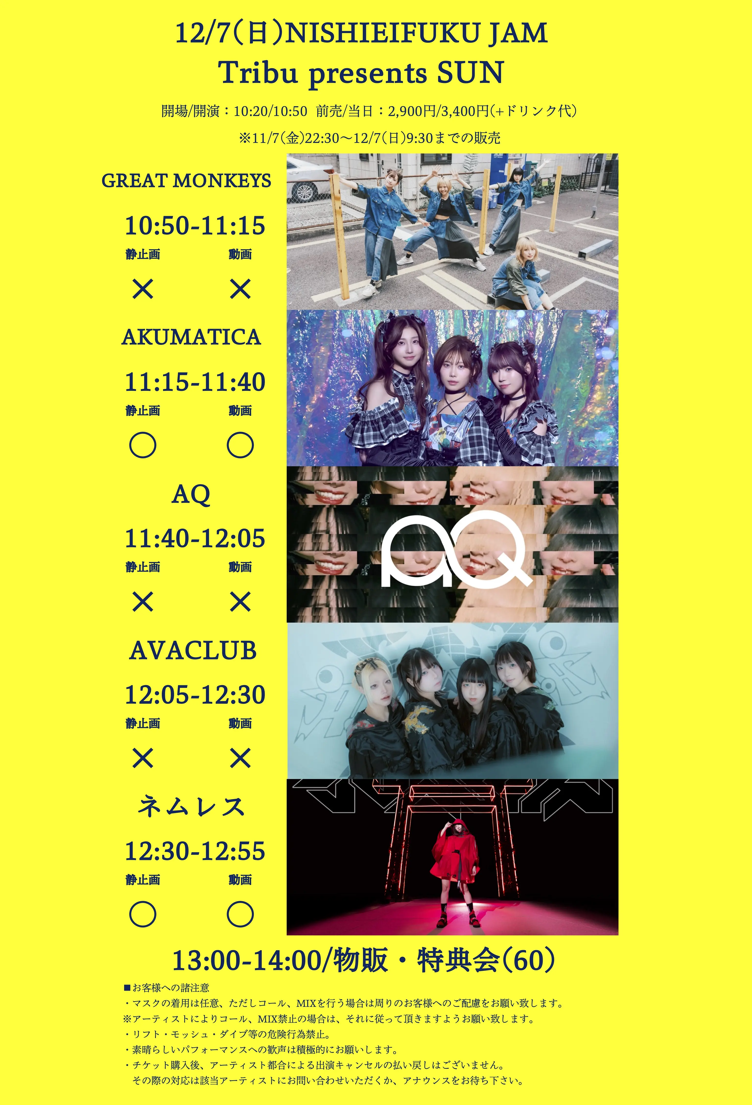 出演者 AKUMATICA / GREAT MONKEYS / AQ / AVACLUB / ネムレス
