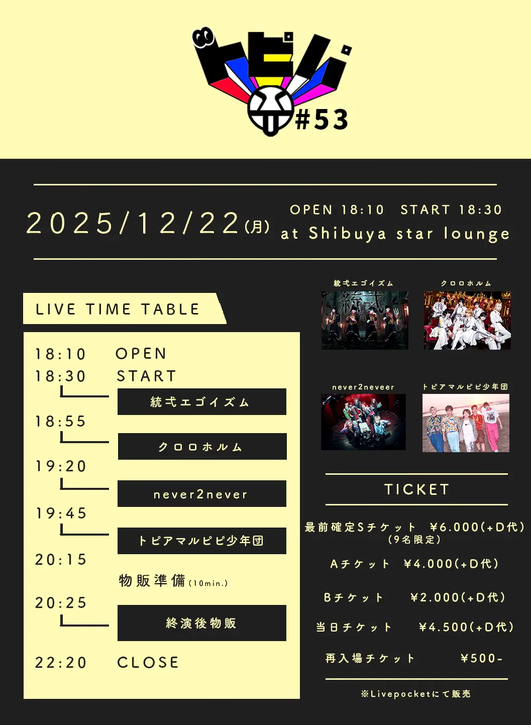 出演者 トピアマルピピ少年団 / クロロホルム / 統弌エゴイズム / never2never