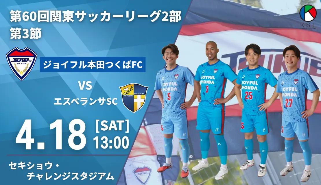 4/18(土)13時キックオフ 第60回関東サッカーリーグ2部第3節 ジョイフル本田つくばFC vs エスペランサSC