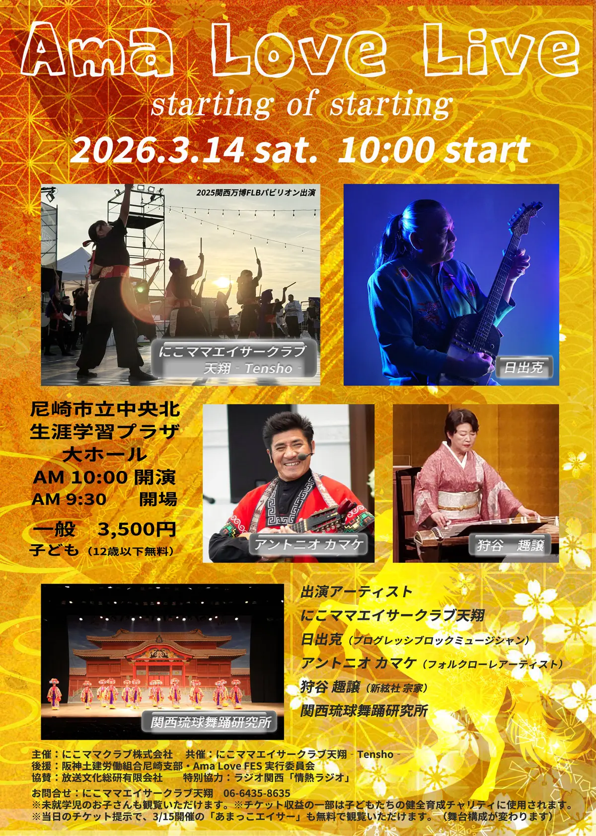出演者 にこママエイサークラブ天翔 / 日出克(プログレッシブロックミュージシャン) / アントニオ カマケ(フォルクローレアーティスト) / 狩谷 趣譲(新絃社 宗家) / 関西琉球舞踊研究所