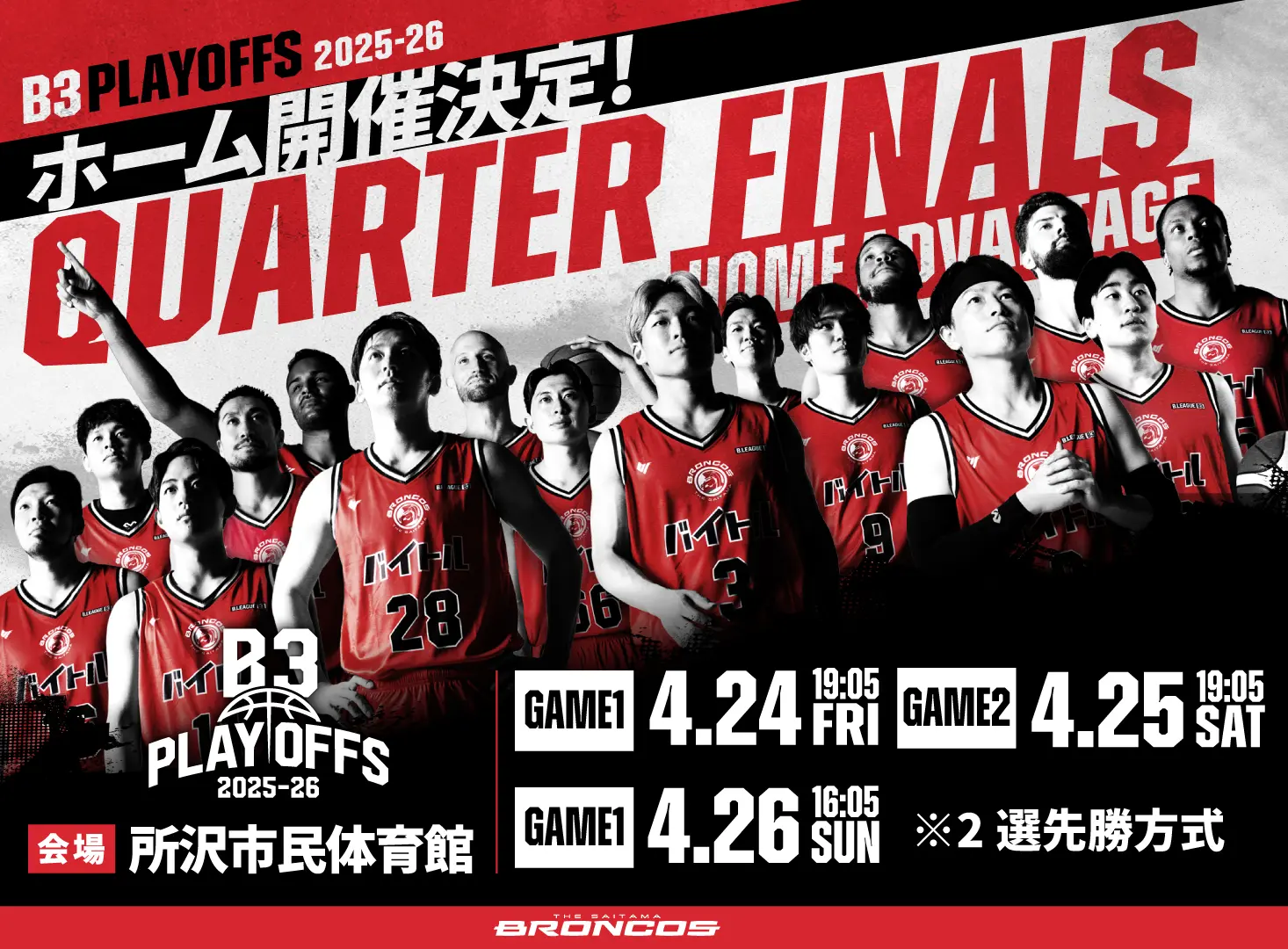 4/24(金)さいたまブロンコスvs未定 B3 PLAYOFFS QUARTERFINALS(準々決勝)