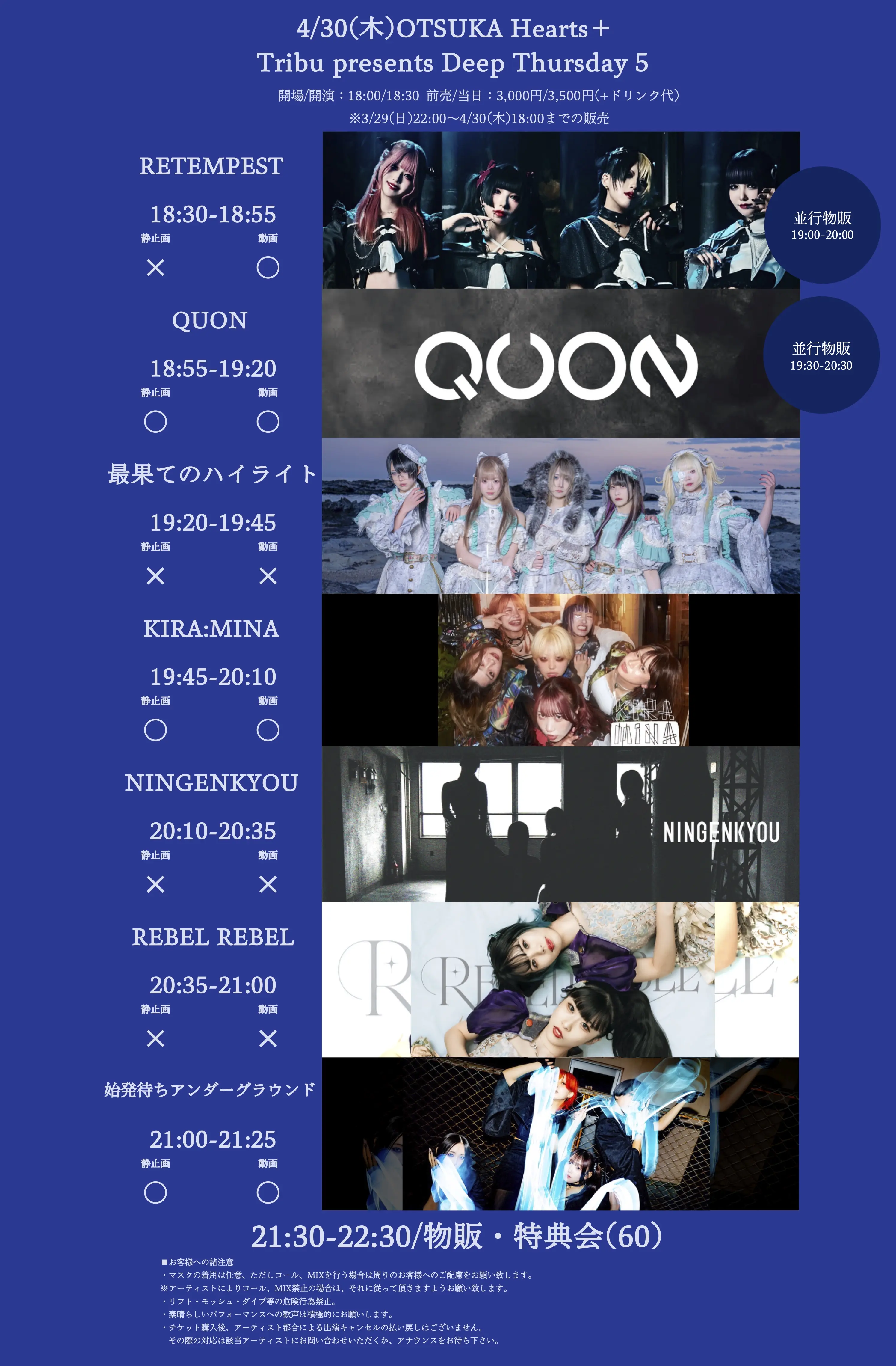 出演者 RETEMPEST / QUON / 最果てのハイライト / KIRA:MINA / NINGENKYOU / REBEL REBEL / 始発待ちアンダーグラウンド