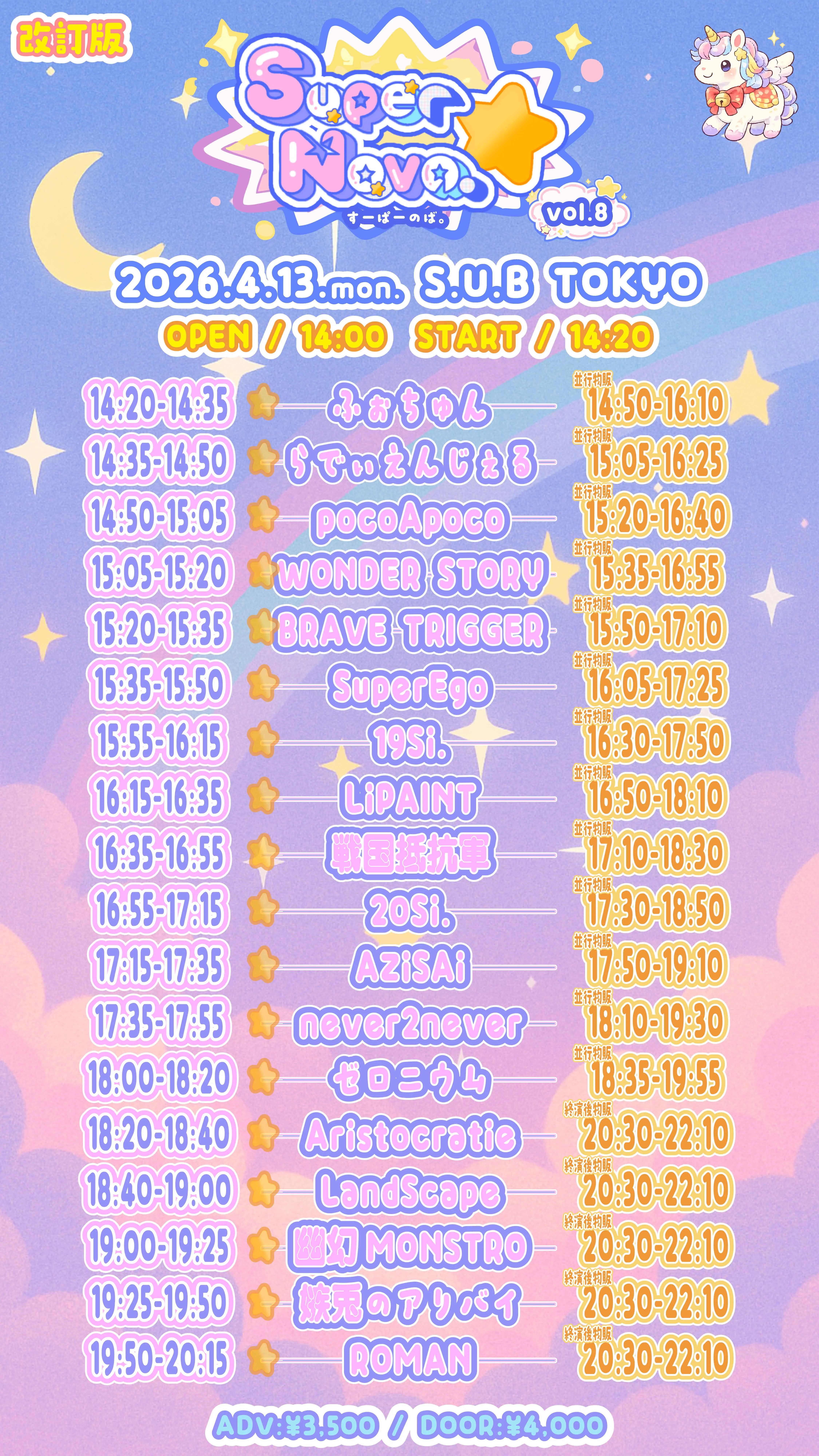 出演者 20SI. / ふぉちゅん / 19Si. / pocoApoco / WONDER STORY / SuperEgo / LiPAINT / 戦国抵抗軍 / AZiSAi / never2never / ゼロニウム / LandScape / 幽幻MONSTRO / 嫉兎のアリバイ / ROMAN / Aristocratie / らでぃえんじぇる / BRAVE TRIGGER