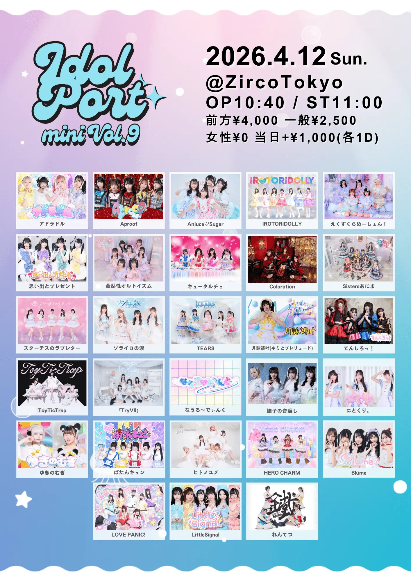 出演者 アドラドル / Aproof / Anluce♡Sugar / iROTORiDOLLY / えくすくらめーしょん! / 思い出とプレゼント / 蓋然性オルトイズム / キュータルチェ / Coloration / Sistersあにま / スターチスのラブレター / ソライロの涙 / TEARS / 月詠祷叶(キミとプレリュード) / てんしろっ! / ToyTicTrap / なうろ〜でぃんぐ / 撫子の音返し / にとくり。 / ゆきのむぎ / ばたんキュン / ヒトノユメ / HERO CHARM / Blüme / LOVE PANIC! / LittleSignal / れんてつ / 『TryVII』