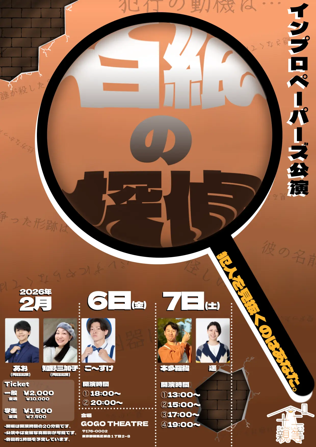 出演者 松尾千晶(劇団カタオモイ) / 久永柚月(劇団カタオモイ) / もつなべ(劇団凛瞳) / 𡌶紗久良(劇団凛瞳) / 宮坂暖菜(劇団アラホシ) / 真弥 / 馬場壮汰(岡山大学演劇部) / 仁科勇人(岡山大学演劇部) / 小藤慎也