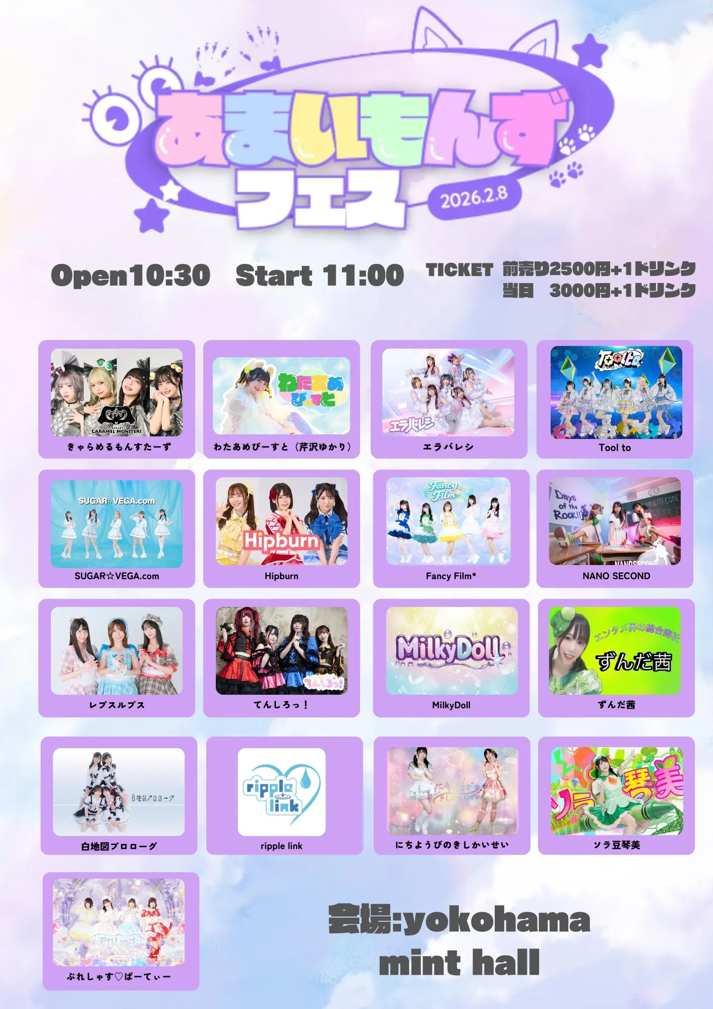 出演者 わたあめびーすと(芹沢ゆかり) / きゃらめるもんすたーず / エラバレシ / Tool to / SUGAR⭐︎VEGA.com / Hipburn / Fancy Film* / NANO SECOND / レプスルプス / てんしろっ! / MilkyDoll / ずんだ茜 / ripple link / にちようびのきしかいせい / ソラ豆琴美 / 白地図プロローグ / ぷれしゃす♡ぱーてぃー
