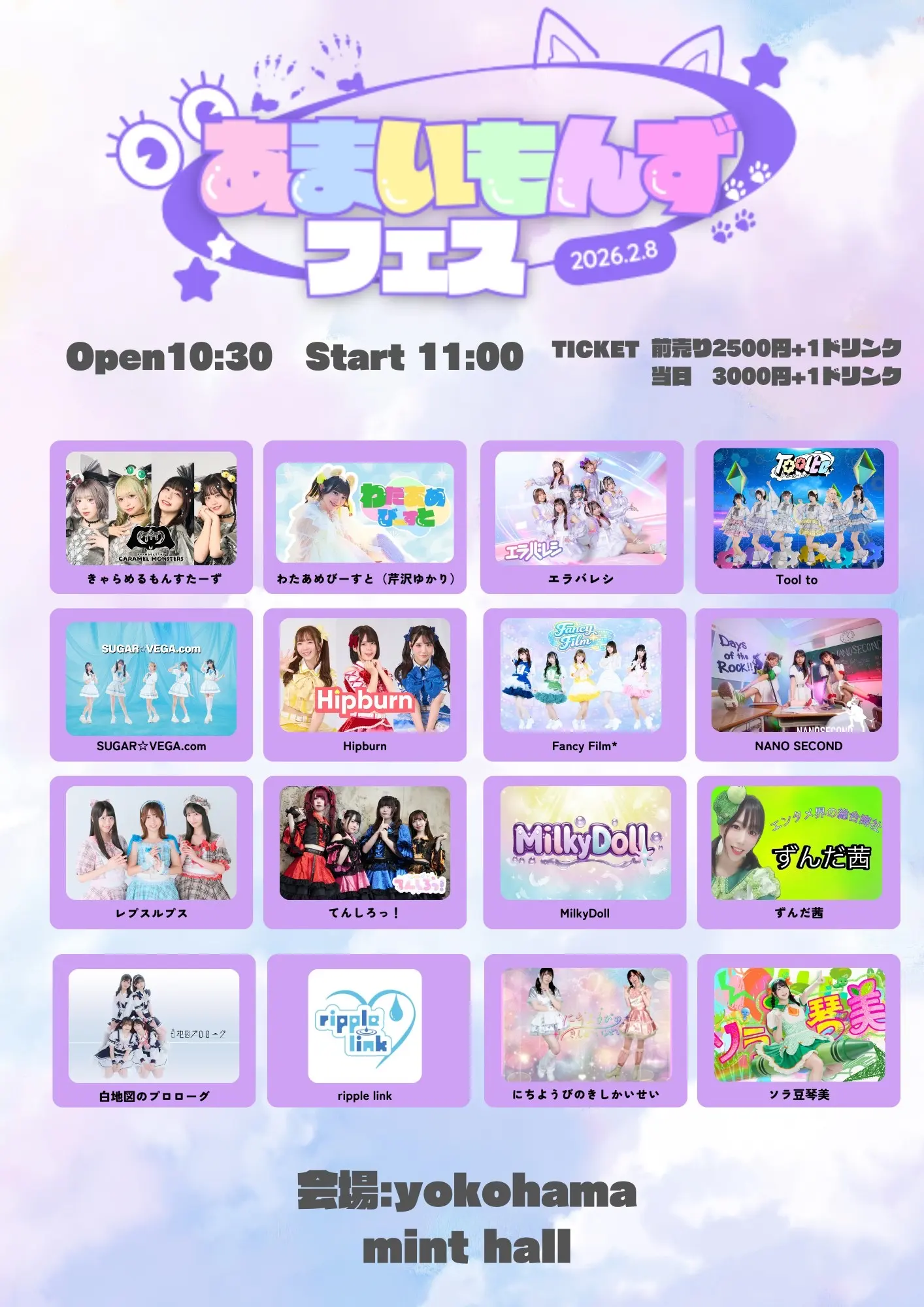 出演者 わたあめびーすと(芹沢ゆかり) / きゃらめるもんすたーず / エラバレシ / Tool to / SUGAR⭐︎VEGA.com / Hipburn / Fancy Film* / NANO SECOND / レプスルプス / てんしろっ! / MilkyDoll / ずんだ茜 / ripple link / にちようびのきしかいせい / 白地図のプロローグ / ソラ豆琴美
