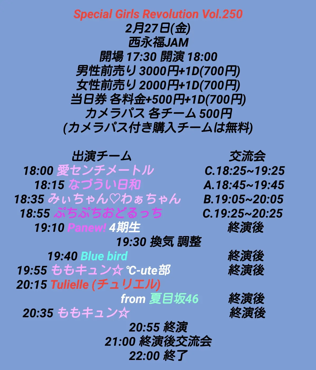 出演者 愛センチメートル / なづうい日和 / みぃちゃん♡わぁちゃん / ぷちぷちおどるっち / Panew! 4期生 / Blue bird / ももキュン☆ ℃-ute部 / Tulielle (チュリエル) from 夏目坂46 / ももキュン☆
