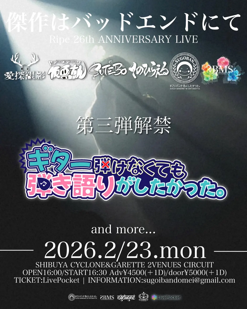 出演者 すごいバンド名にしたかった。 / SBMS from すごいバンド名にしたかった。 / SUTEBO / てのひらえる / 愛探眼影 / サディスティック仮面ちゃん / 弾き語りできないけど弾き語りしたかった。コラボステージ