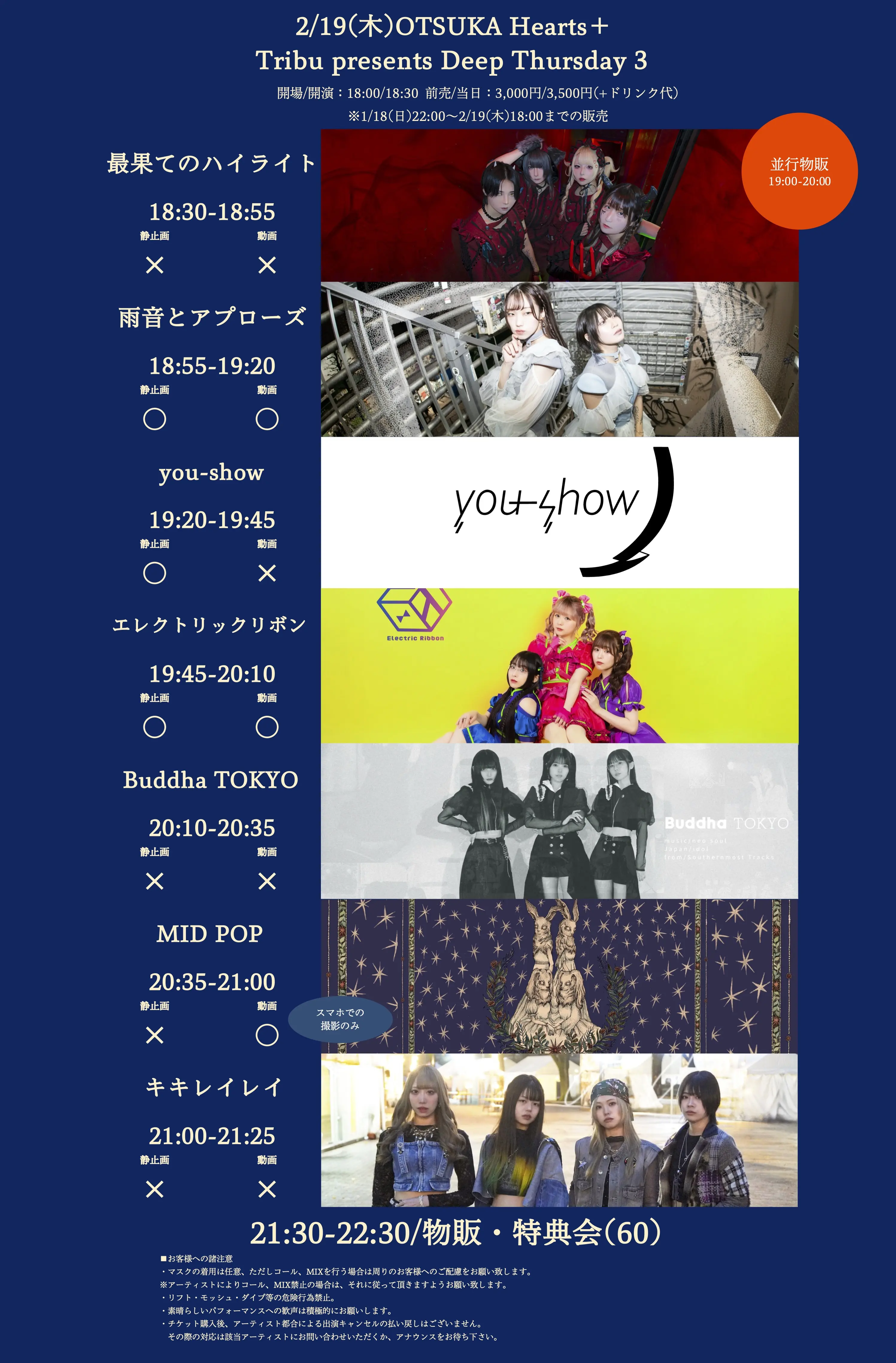 出演者 雨音とアプローズ / キキレイレイ / 最果てのハイライト / you-show / エレクトリックリボン / Buddha TOKYO / MID POP
