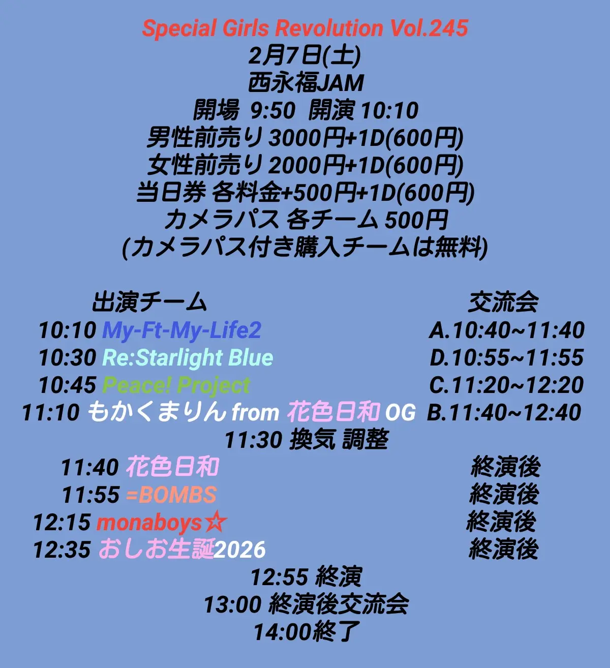 出演者 My-Ft-My-Life2 / Re:Starlight Blue / Peace! Project / もかくまりん from 花色日和 / 花色日和 / =BOMBS / monaboys☆ / おしお生誕2026
