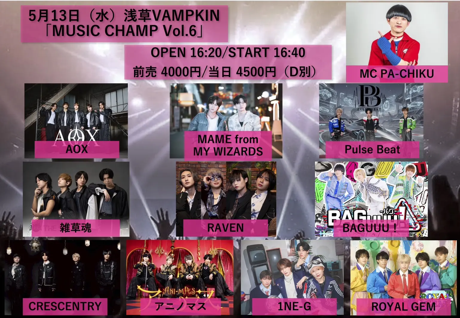 出演者 PA-CHIKU / 雑草魂 / ROYAL GEM / RAVEN / Pulse Beat / 1NE-G / CRESCENTRY / AOX / MAME from MY WIZARDS / BAGUUU! / アニノマス