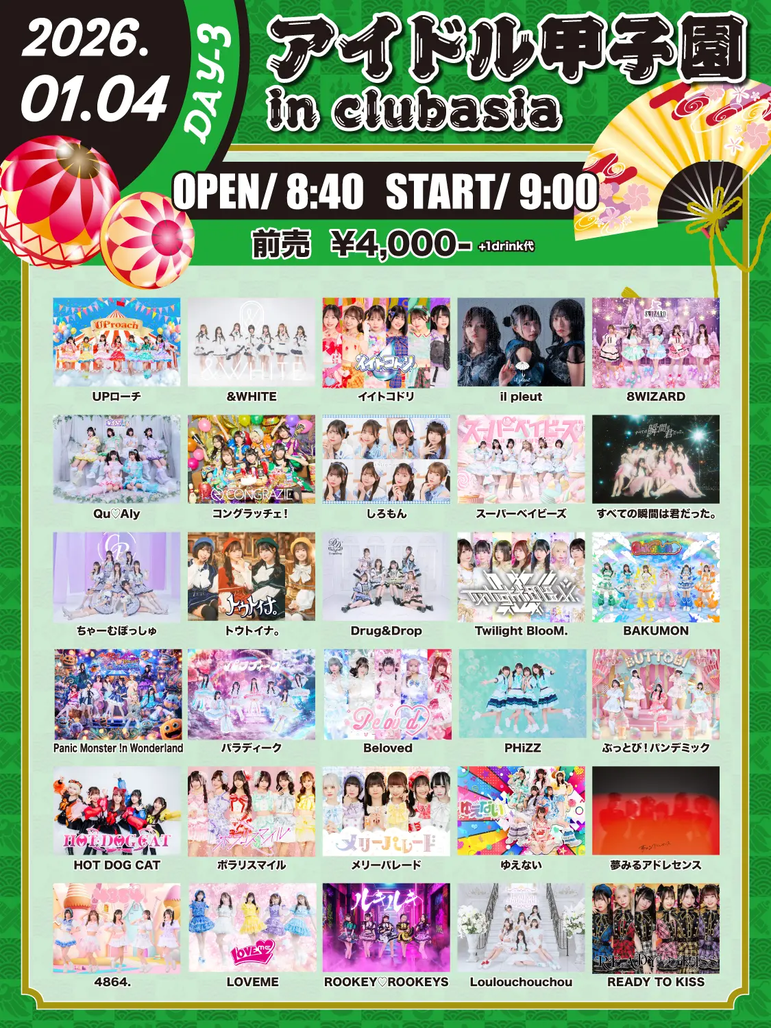 出演者 イイトコドリ / Qu♡Aly / コングラッチェ! / スーパーベイビーズ / ちゃーむぽっしゅ / ポラリスマイル / READY TO KISS / UPローチ / &WHITE / il pleut / しろもん / すべての瞬間は君だった。 / トウトイナ。 / Drug&Drop / Twilight BlooM. / BAKUMON / Panic Monster !n Wonderland / Beloved / PHiZZ / ぶっとび!パンデミック / HOT DOG CAT / メリーパレード / ゆえない / 夢みるアドレセンス / 4864. / LOVEME / ROOKEY♡ROOKEYS / Loulouchouchou / 8WIZARD