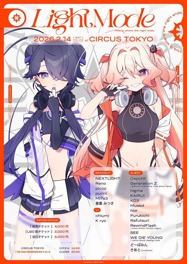 出演者 NEXTLIGHT / Reno / picco / purini / Mi7s3 / 倉重 みつき / Capchii / Generation Z / gaburyu / nyankobrq / Yaca / higma / KAIRUI / KO3 / Mused / Nor / purukichi / Rafutsuri / RewindFlash / Letsu / Dairou Tanaka / nagqra / SEE / We Die Young / vishnu okuno / Redsign / ど~ぱみん / きあと / chlumi / K ryo