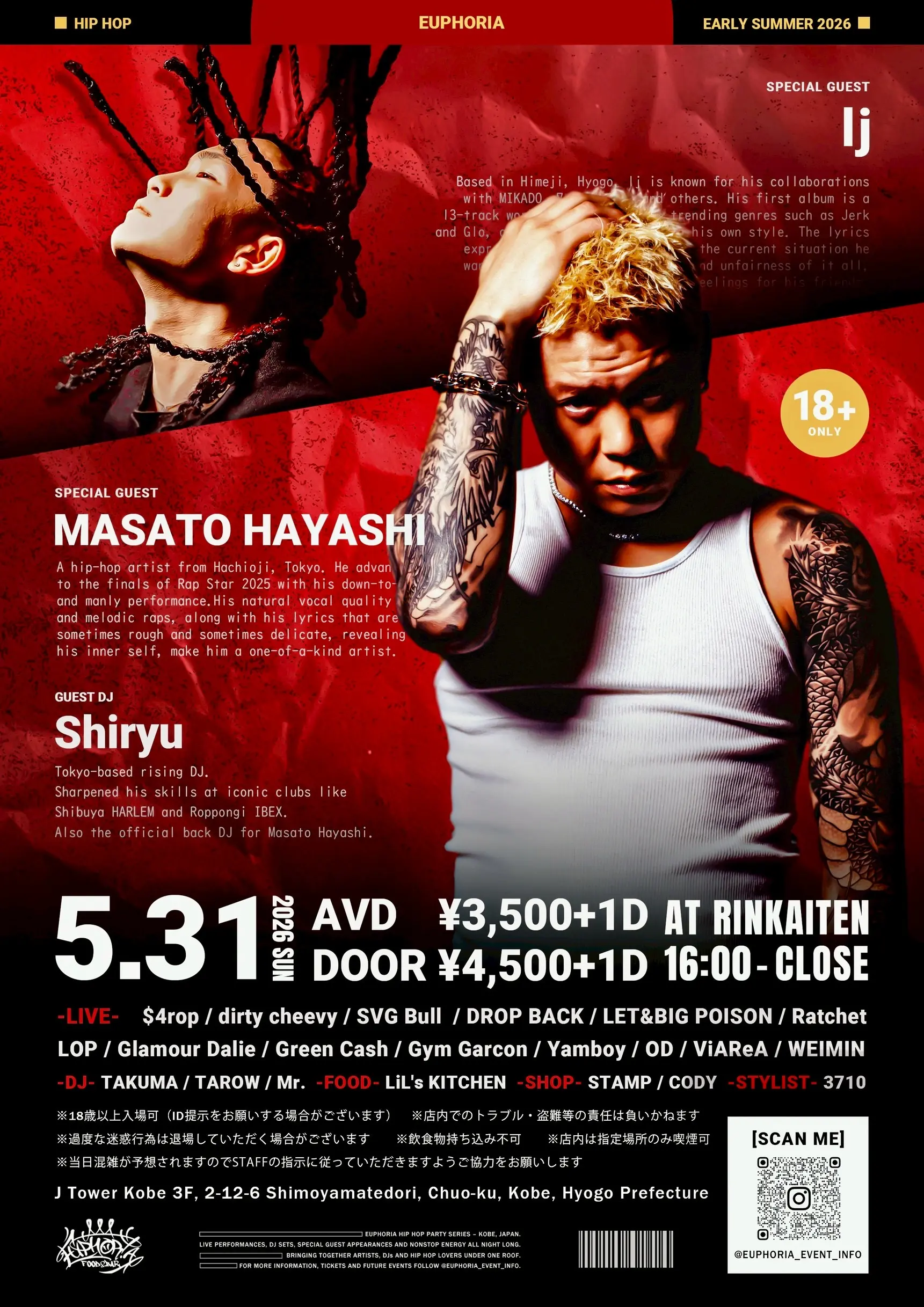 出演者 Masato Hayashi / lj / Shiryu / TAROW / TAKUMA / $4rop / dirty cheevy / SVGBull / DROP BACK / LET&POISON / Glamour Dalie / Green Cash / Gym Garcon / Ratchet / LOP / ViAReA / OD / WEIMIN / Mr. / STAMP / CODY / 3710 / LiL's KITCHEN