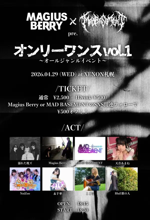 出演者 BluE歌の人 濡れた枕ズ MagiusBerry NoiZoo ここな 衣千華 MAD BASEMENT 天音あまね