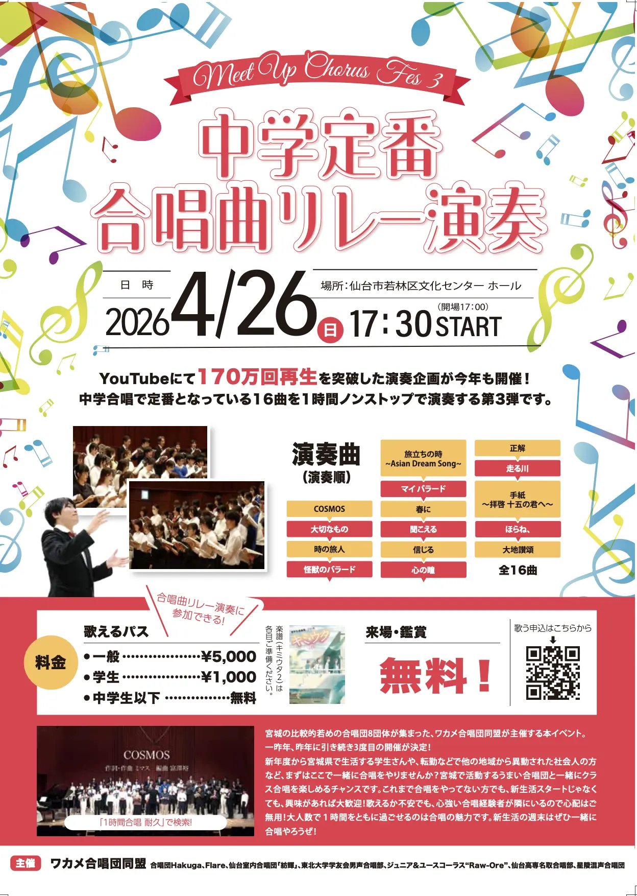 出演者 合唱団Hakuga / 東北大学混声合唱団 / 東北大学男声合唱団 / 仙台室内合唱団「紡輝」 / 仙台高専名取合唱部 / Flare / ジュニア&ユースコーラス“Raw-Ore”