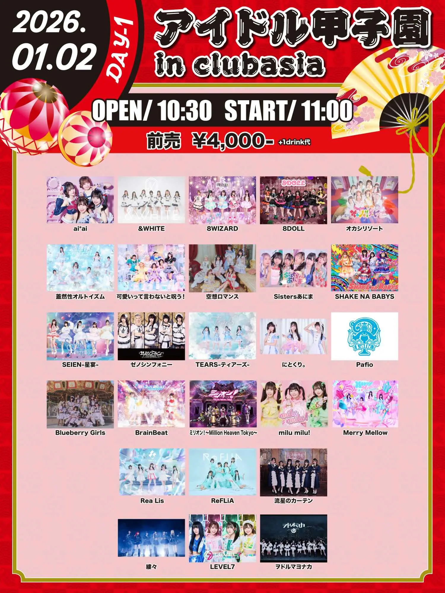 出演者 ai*ai / 8WIZARD / 8DOLL / オカシリゾート / 蓋然性オルトイズム / 空想ロマンス / Sistersあにま / SHAKE NA BABYS / SEIEN-星宴- / TEARS-ティアーズ- / にとくり。 / Pafio / Blueberry Girls / BrainBeat / ミリオン!〜Million Heaven Tokyo〜 / milu milu! / 流星のカーテン / 縷々 / LEVEL7 / ヲドルマヨナカ / ReFLiA / ゼノシンフォニー / 可愛いって言わないと呪う! / Rea Lis / &WHITE / Merry Mellow