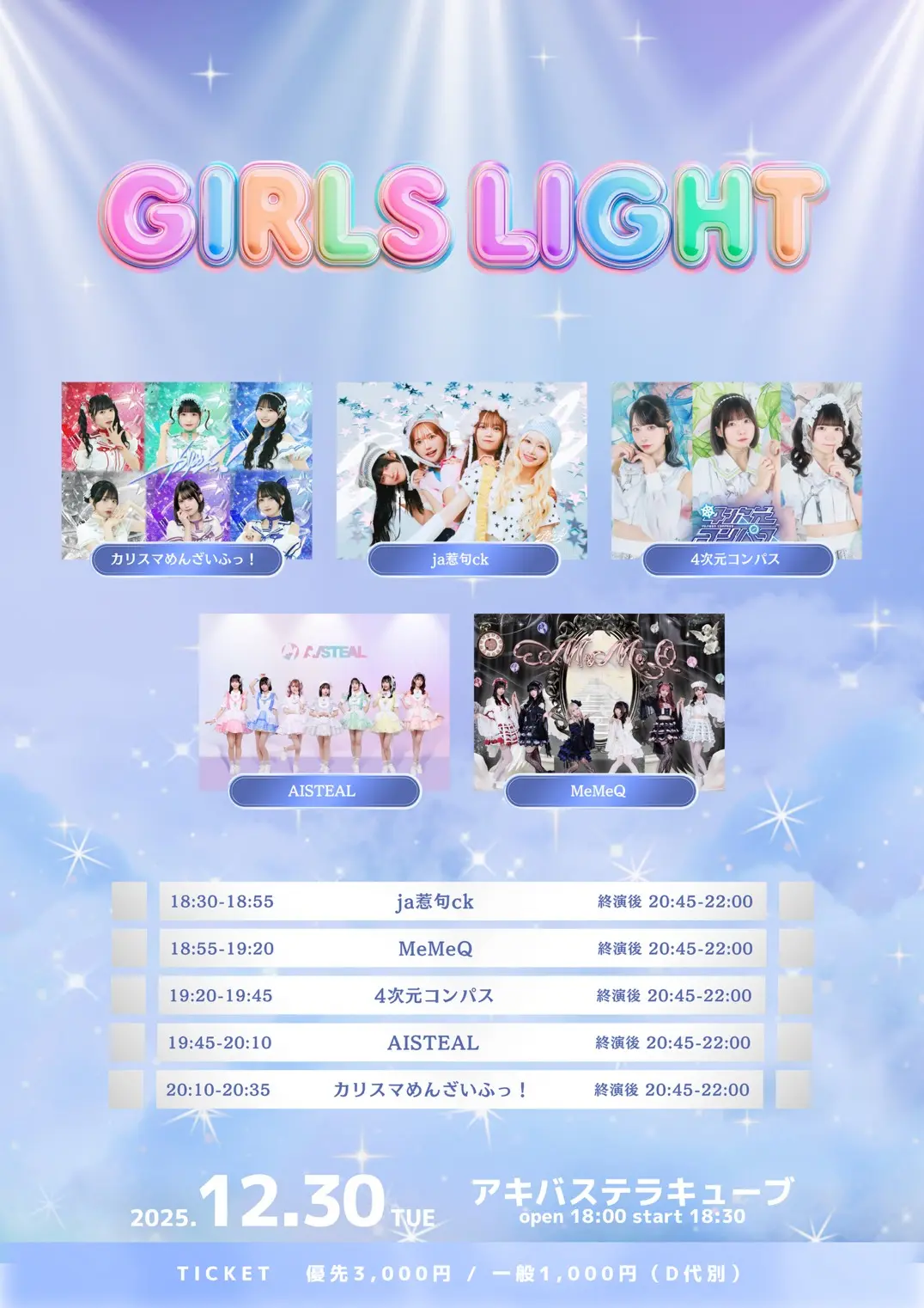 出演者 カリスマめんざいふっ / ja惹句ck / 4次元コンパス / AISTEAL / MeMeQ