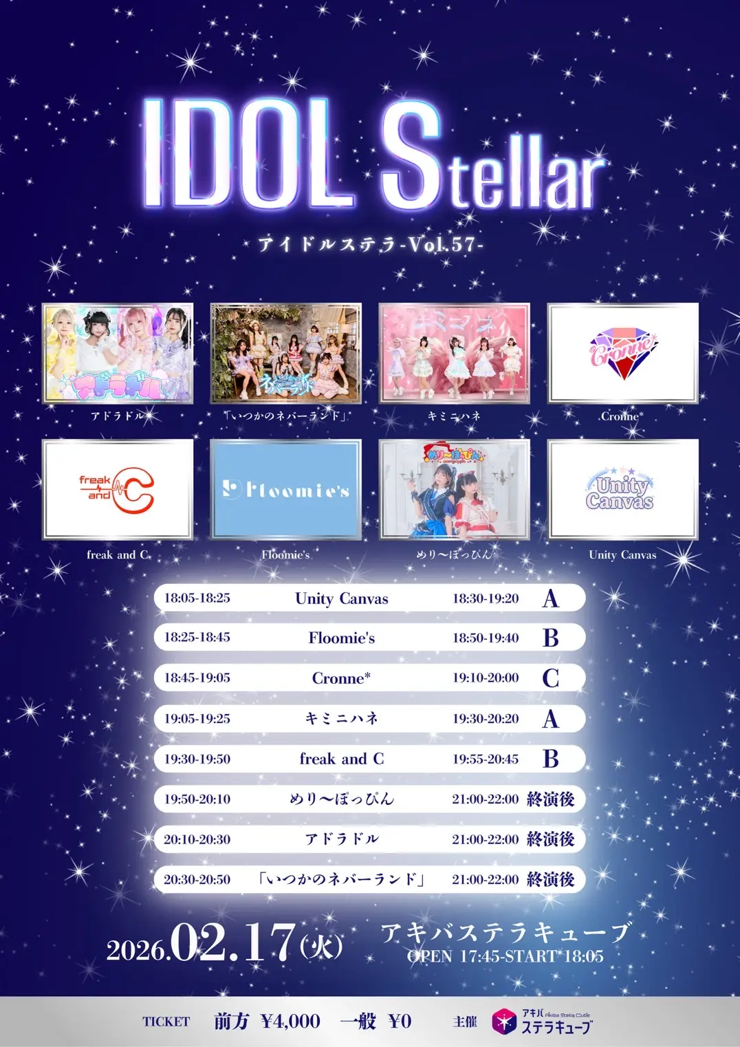 出演者 キミニハネ / めり〜ぽっぴん / アドラドル / 「いつかのネバーランド」 / Cronne* / freak and C / Floomie’s / Unity Canvas