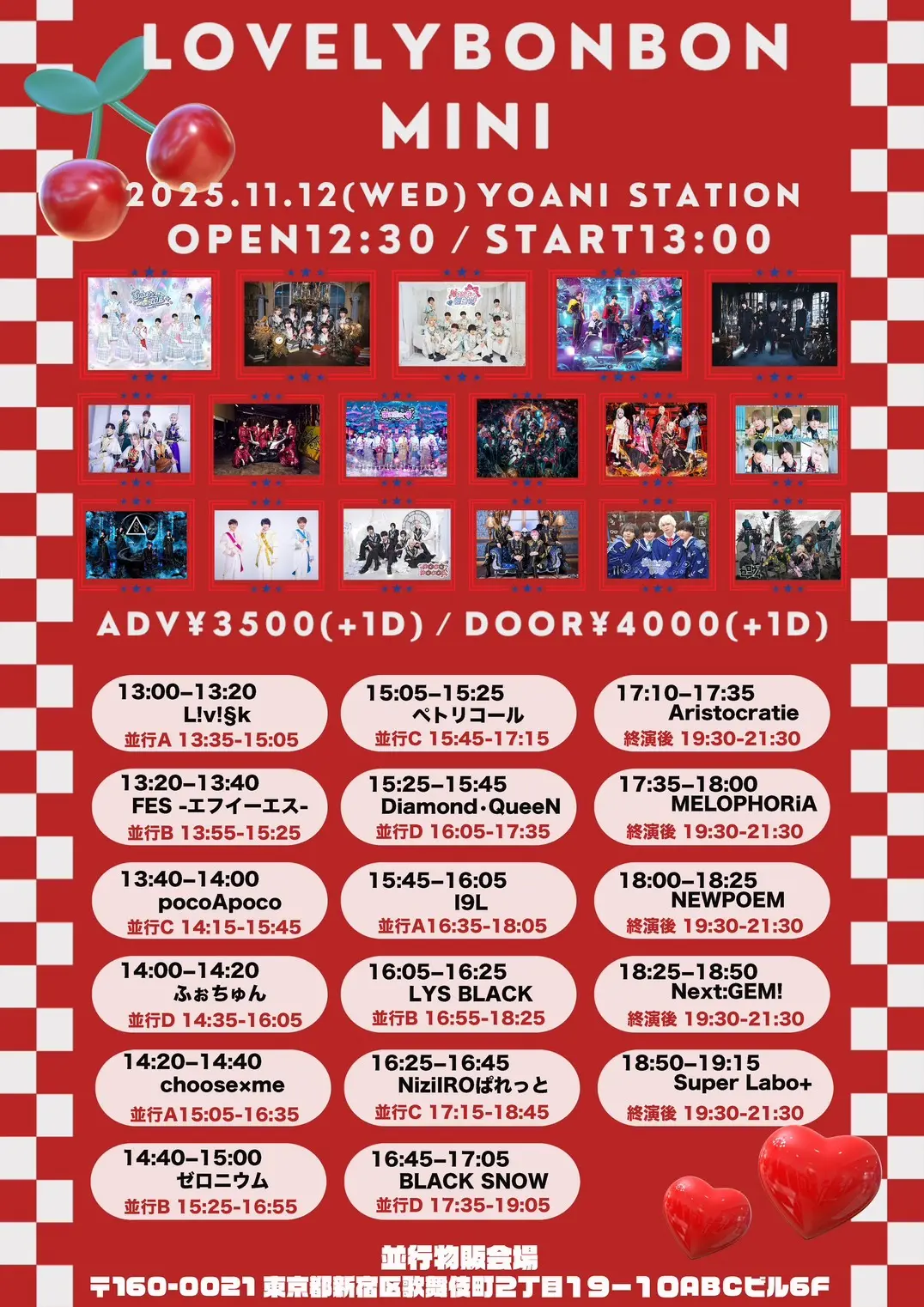 出演者 L!v!§k / FES -エフイーエス- / pocoApoco / ふぉちゅん / choose×me / ゼロニウム / ペトリコール / Diamond•QueeN / I9L / LYS BLACK / NiziIROぱれっと / BLACK SNOW / Aristocratie / MELOPHORiA / NEWPOEM / Next:GEM! / Super Labo+