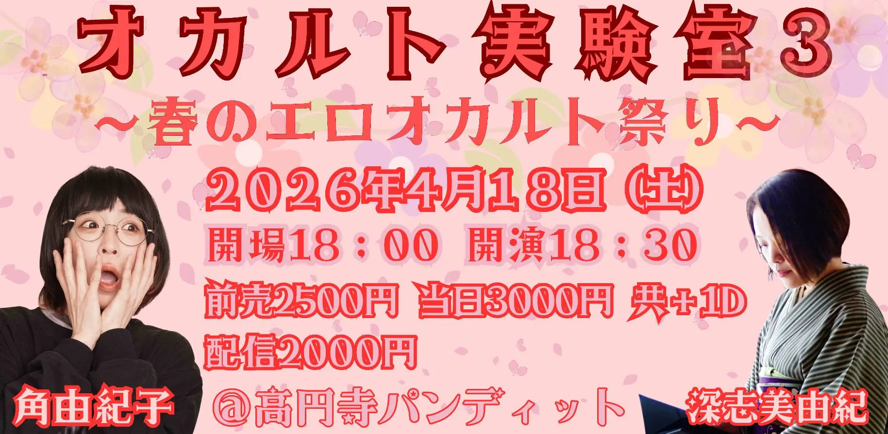 2026年4月18日(土)角由紀子×深志美由紀 オカルト実験室3 『〜春のエロオカルト祭り〜』