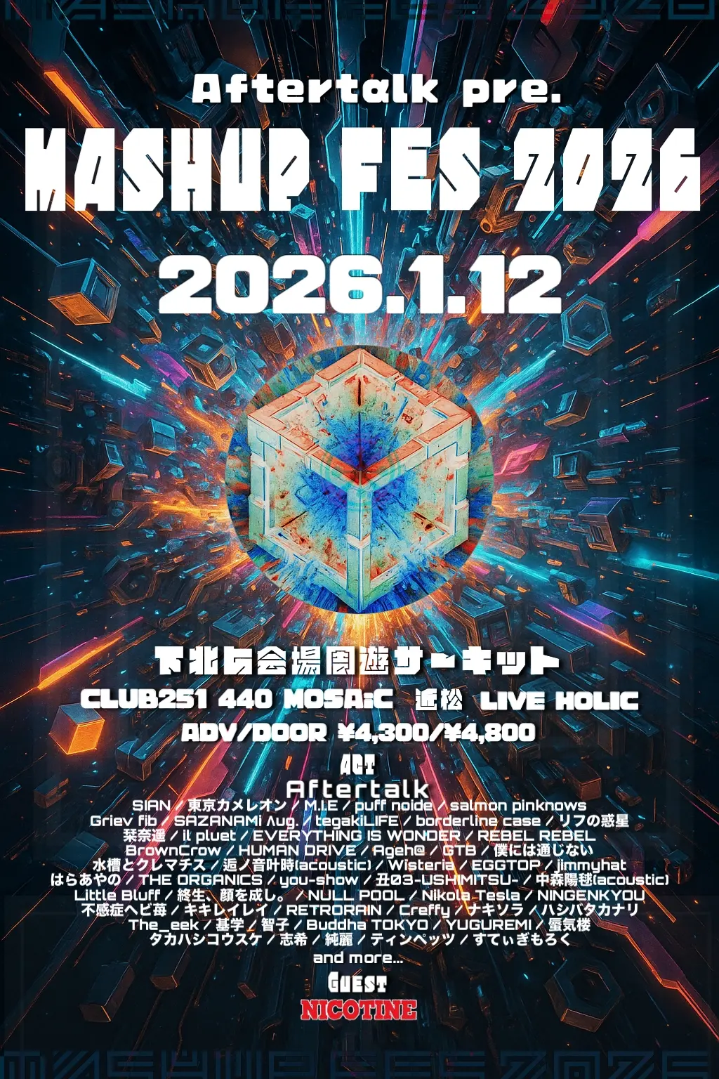出演者 Aftertalk / SIAN / M.I.E / 東京カメレオン / puff noide / salmon pinknows / Griev fib / SAZANAMi Λug. / tegakiLIFE / borderline case / リフの惑星 / 栞奈遥 / il pluet / EVERYTHING IS WONDER / REBEL REBEL