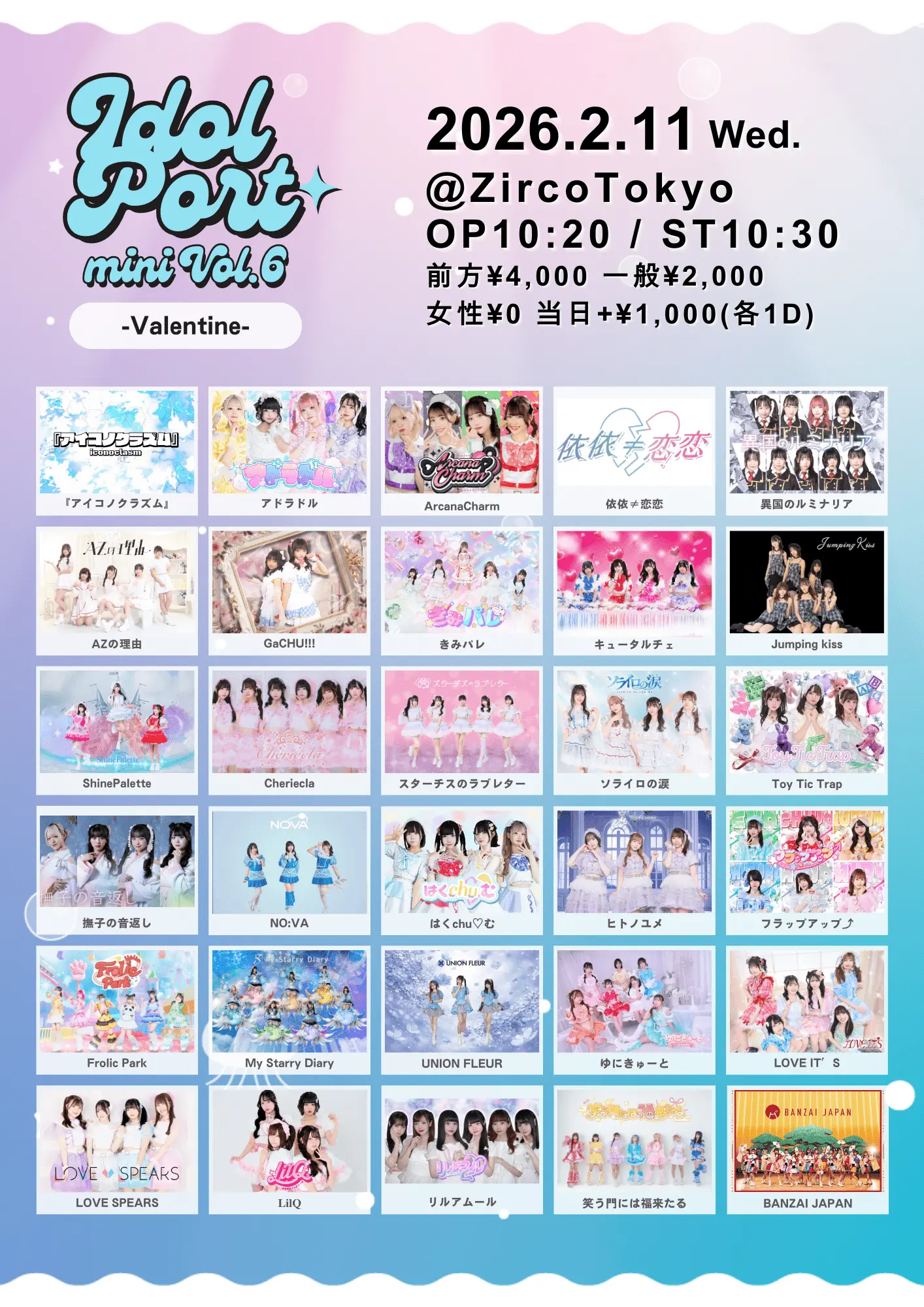 出演者 アイコノクラズム / アドラドル / ArcanaCharm / 依依≠恋恋 / 異国のルミナリア / AZの理由 / GaCHU!!! / きみパレ / キュータルチェ / Jumping kiss / ShinePalette / Cheriecla / スターチスのラブレター / Toy Tic Trap / 撫子の音返し / NO:VA / はくchu♡む / ヒトノユメ / フラップアップ⤴︎ / Frolic Park / My Starry Diary / UNION FLEUR / ゆにきゅーと / LOVE IT′S / LOVE SPEARS / リルアムール / 笑う門には福来たる / BANZAI JAPAN / ソライロの涙 / LilQ